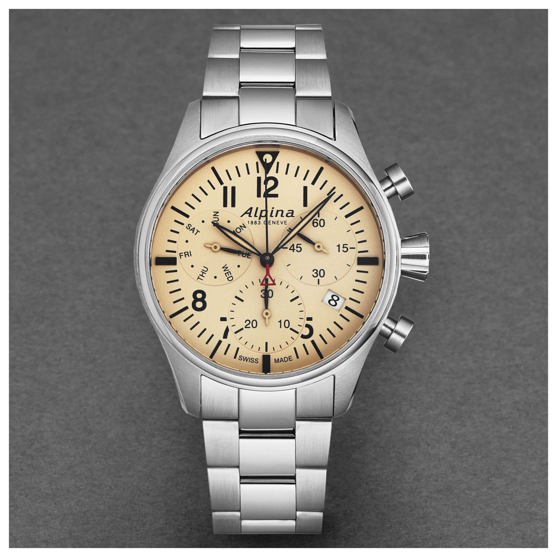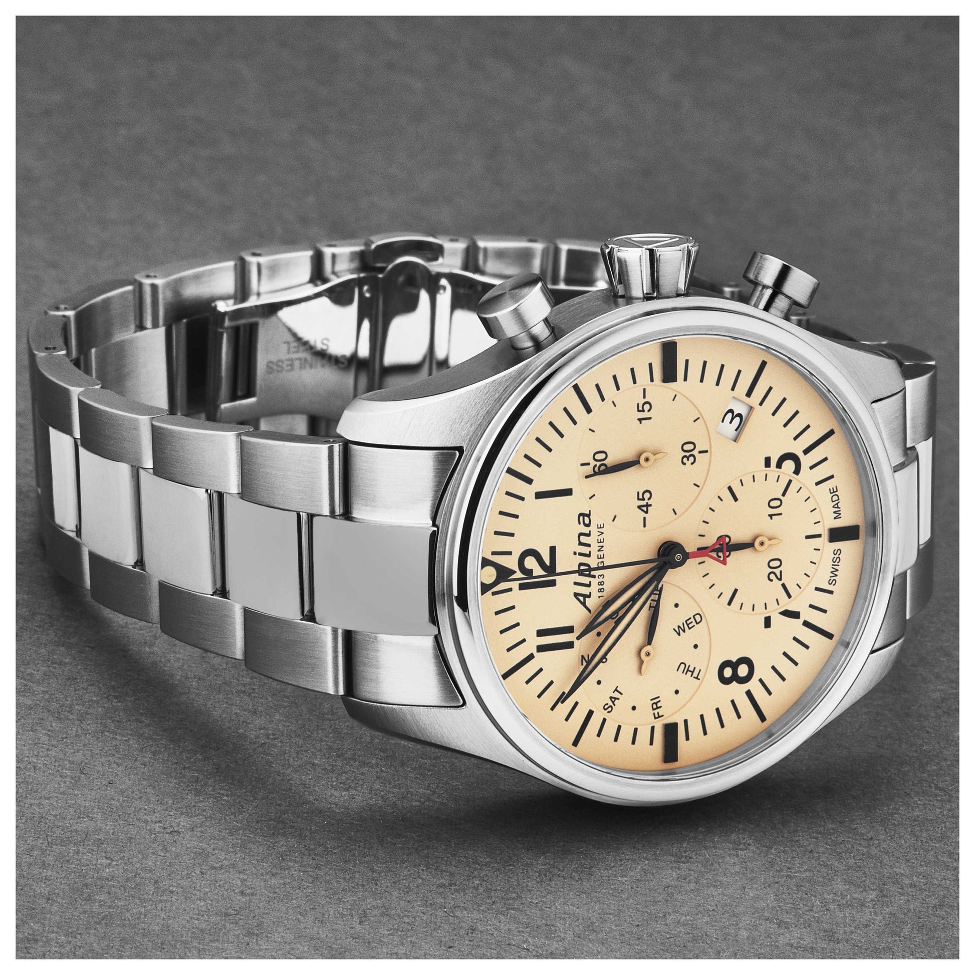 Exude sophistication with the Alpina Startimer Pilot men's watch, a Swiss-made timepiece that reflects the precision of its origins. This round quartz watch features a 42mm stainless steel case, enclosed by scratch-resistant sapphire crystal. Its screw-down crown and 100m water resistance ensure durability, while the closed case back offers a sleek finish. The beige dial presents a date feature for practicality. This timepiece is completed with a silver stainless steel bracelet that fastens securely with a deployment clasp, blending style and functionality seamlessly. AL371BG4S6B