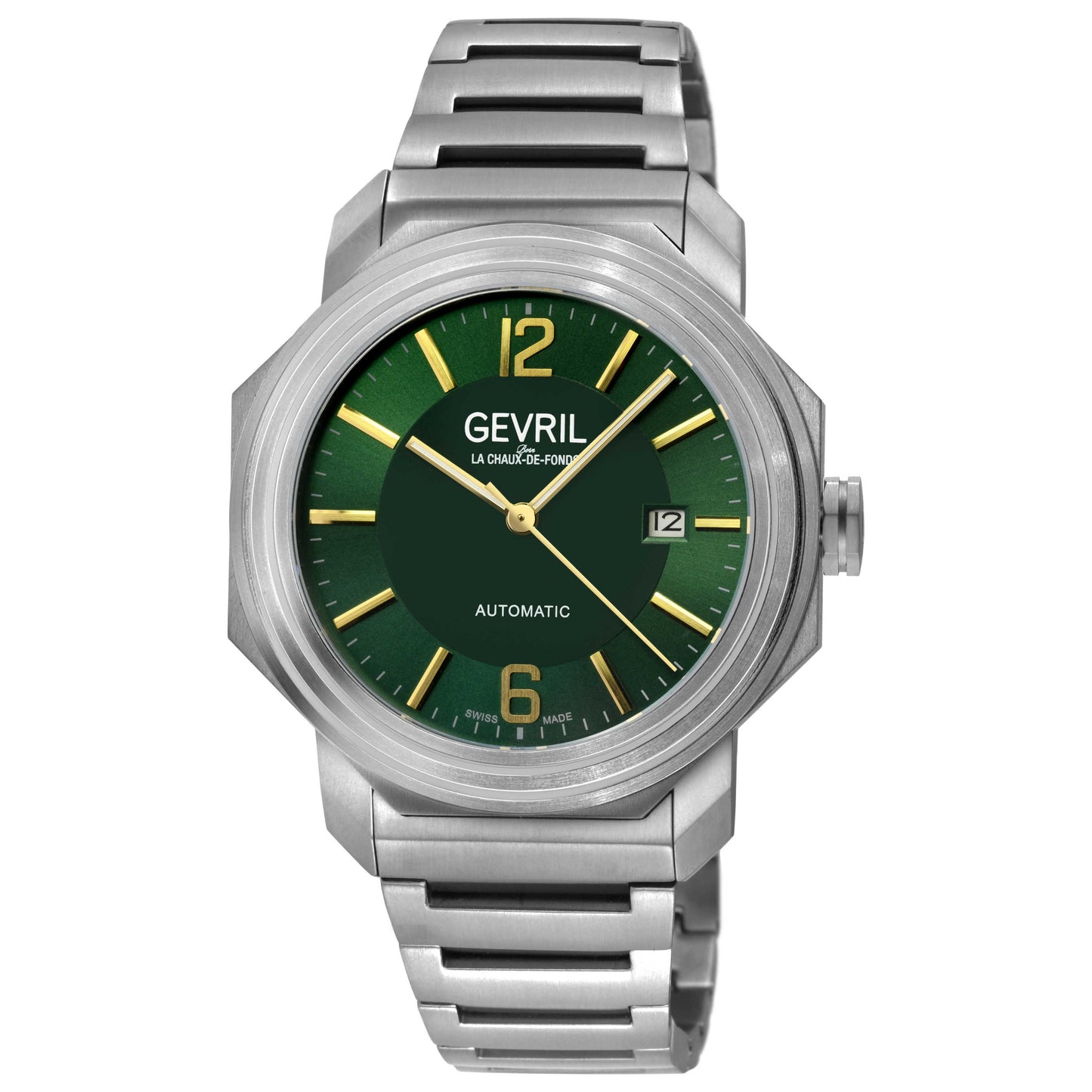 Showcase your style with the Gevril Roosevelt watch, a Swiss-made marvel for the modern man. This automatic timepiece is constructed from resilient titanium and features a pull and push crown, ensuring the Swiss-made movement's efficiency. Its impressive 43mm case is covered with an anti-reflective, scratch-resistant sapphire crystal and exhibits an exhibition back. The watch displays a compelling green dial, adding depth to its silver titanium bracelet secured by a deployment clasp. Resistant to water up to 50m, it's perfect for everyday wear. Plus, never lose track of dates with the integrated date feature. 46535B