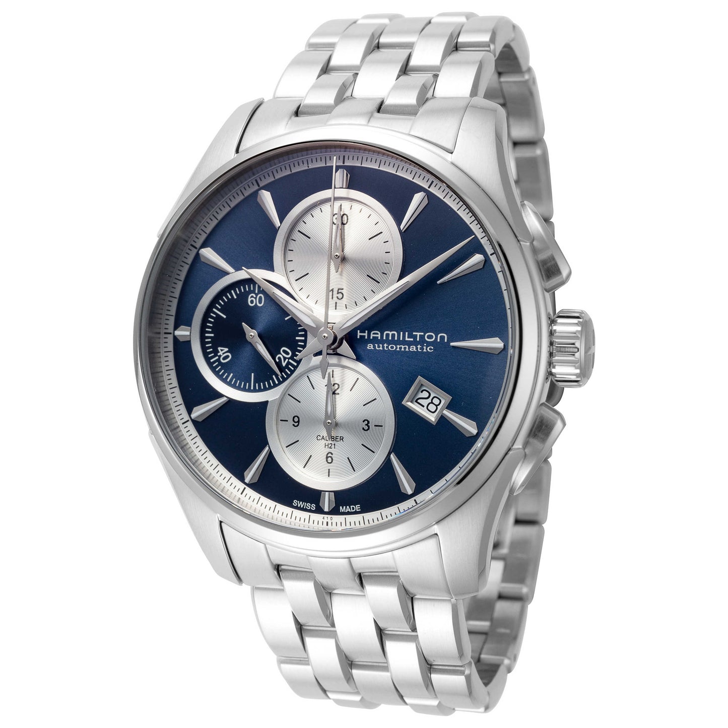 Revel in the classic elegance of the Hamilton American Classic Jazzmaster men’s watch. A sleek blue dial houses luminous hands and stick hour markers. Chronograph functions and a date display at the 4 o’clock position lend additional functionality to this fine timepiece. Equipped with an H-21 caliber automatic movement that offers a 60 hour power reserve, you can rest assured that the Hamilton American Classic Jazzmaster will be keeping proper time. The stainless steel 42mm round case features an exhibition caseback, allowing a glimpse into Swiss quality watchmaking. Armed with scratch resistant sapphire crystal and water resistant to 100 meters, up to 330 feet, this timeless men’s watch offers the ultimate in durability. A silver tone stainless steel bracelet completes this classic timepiece.