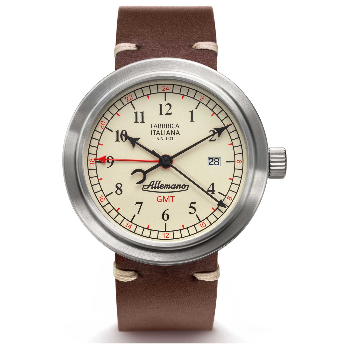 Introduce a vintage twist to your style with the Allemano 1919 GMT Men's Watch. Expertly crafted in Switzerland, this automatic timepiece is powered by Swiss-made movements, which are housed in a 44mm round stainless steel case. The pull and push crown, coupled with a 42-hour power reserve, ensures a seamless experience. Protected by a scratch-resistant sapphire crystal and boasting a 50m water resistance, the watch’s case back remains closed for optimum protection. The dial, in a classic white, contrasts brilliantly with the brown leather strap that fastens securely with a pin buckle. A genuine blend of robust functionality and timeless design, this piece is ideal for any discerning gentleman. GMTA1919SPPW
