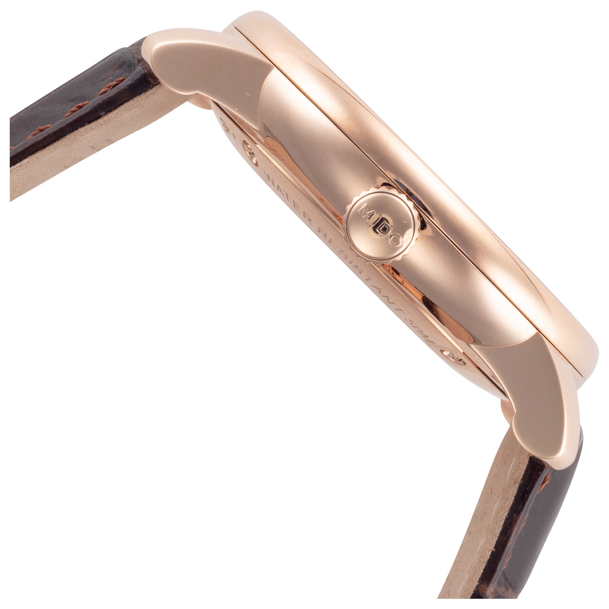 Experience timeless elegance with the Mido Baroncelli Jubilee, a sophisticated men's watch made in Switzerland. Powered by a Mido Calibre 80 automatic movement, this round timepiece features an anthracite dial and a date display at 3 o'clock. Its rose gold PVD stainless steel case measures 42mm and comes with a scratch-resistant sapphire crystal and an exhibition back. This watch has a pull and push crown, offers an impressive 80-hour power reserve, and boasts a water resistance of up to 50m. Complementing the watch's classy aesthetic is its brown leather strap, secured by a deployment clasp. M0376083606200