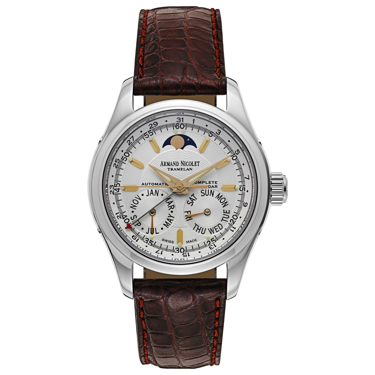 Armand Nicolet, Hunter Complete Calendar, Men's Watch, Stainless Steel Case, Leather Alligator Strap, Automatic, 9042B-1-AS-P742MR9