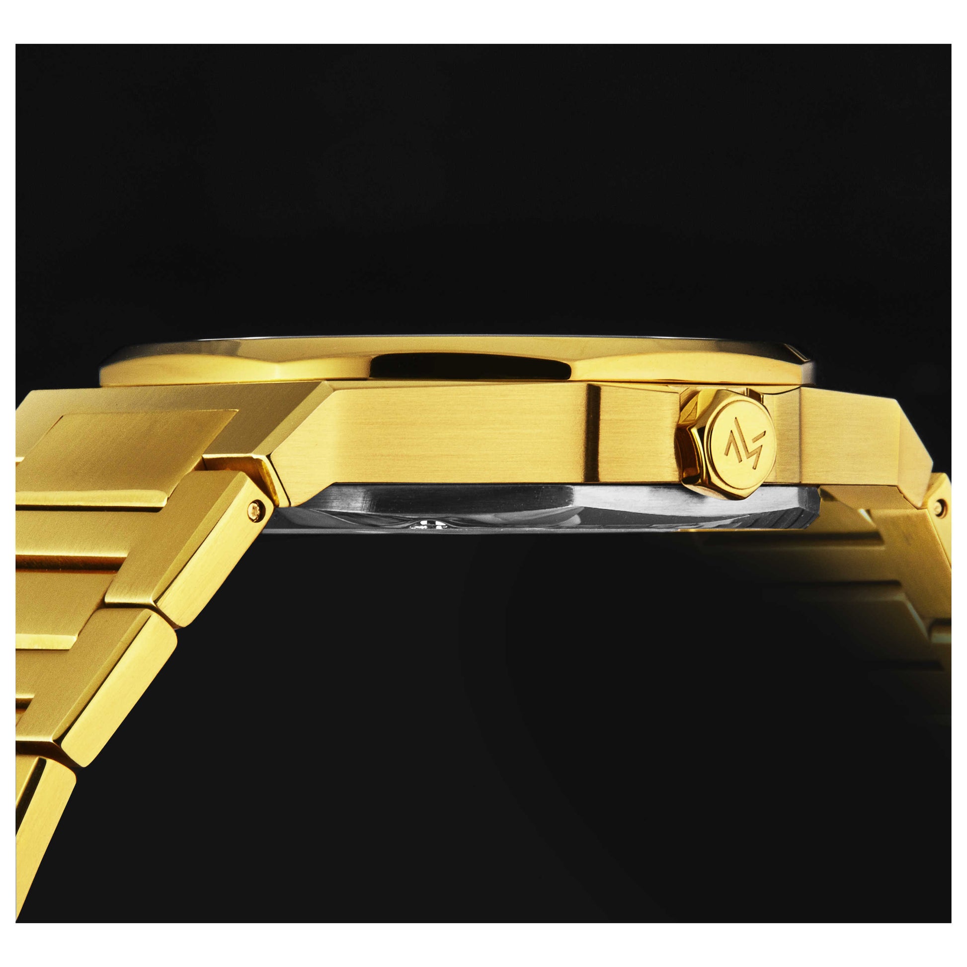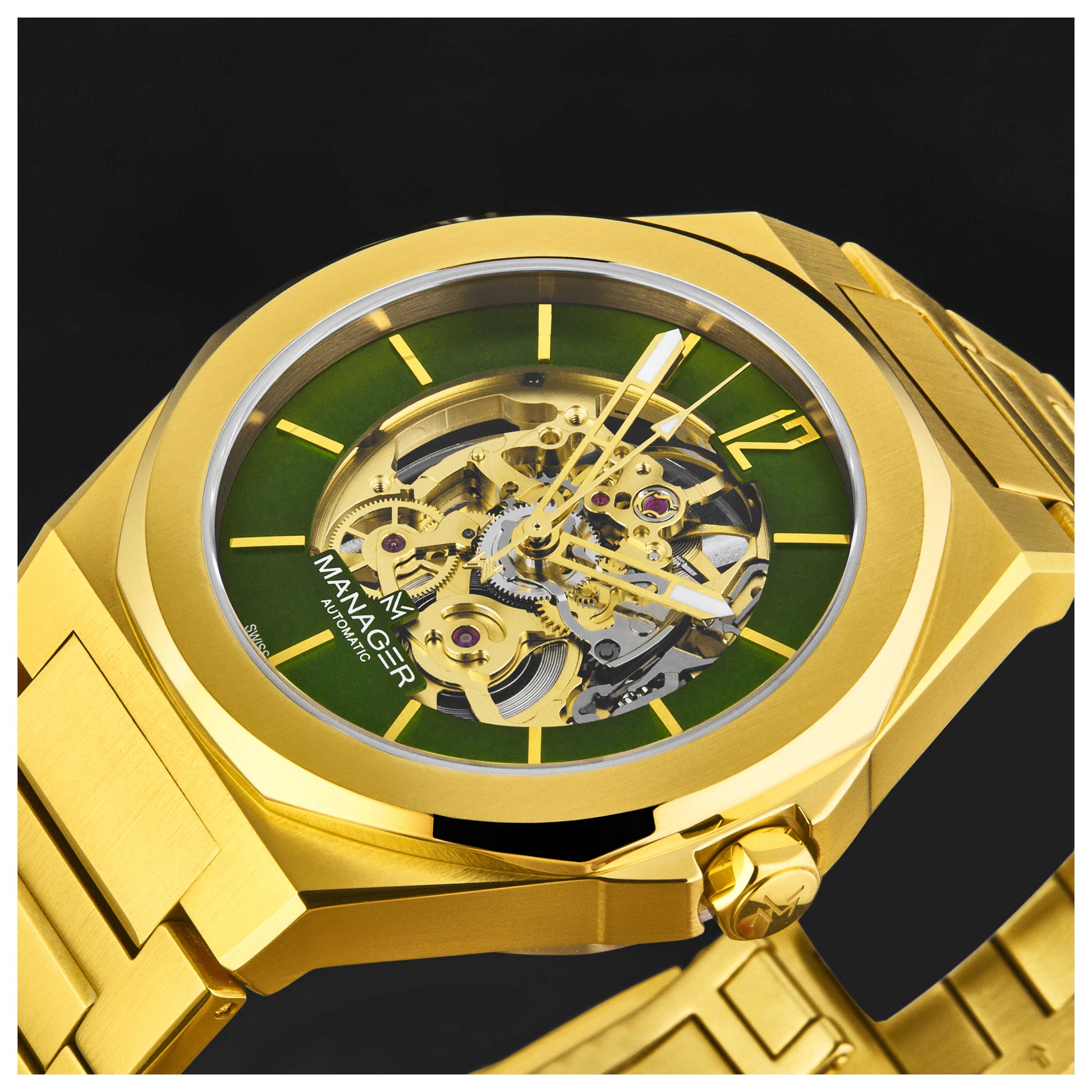 Exhibit timeless elegance with the Manager Open Mind watch, a classic choice for discerning men. Swiss-made, this automatic movement timepiece impresses with its round 43mm stainless steel case showcasing a rich green dial. The case, protected by scratch-resistant sapphire crystal, also boasts an exhibition back, adding a touch of sophistication. The watch's pull and push crown facilitates effortless time adjustment. With a water resistance of up to 50m, it withstands brief immersions. The gleaming gold stainless steel bracelet, secured with a deployment clasp, completes this stunning piece. MAN-RO-12-GM
