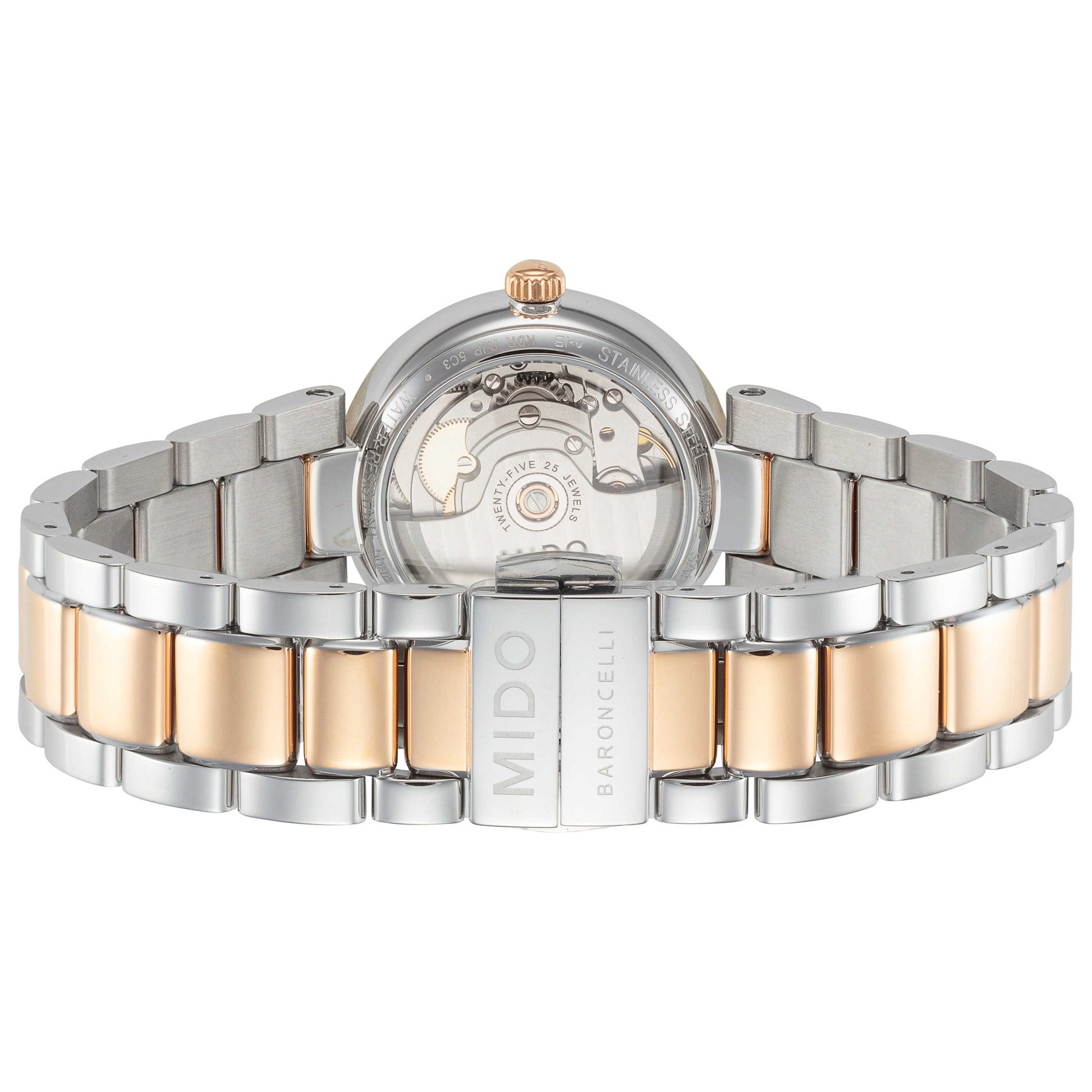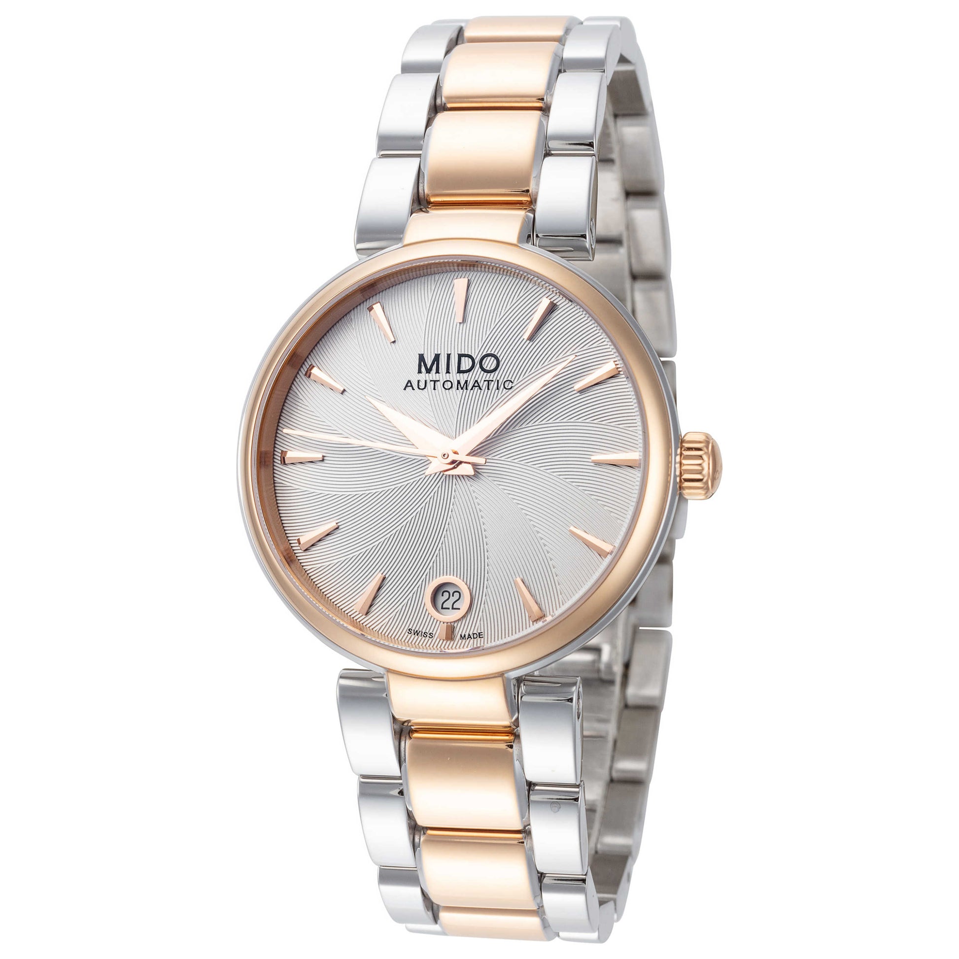 Indulge in the refined craftsmanship of the Mido Baroncelli Donna. A true Swiss-made marvel, this women's watch showcases a silver dial encased in scratch-resistant sapphire crystal, with a discreet date display at 6 o'clock. Its 33mm stainless steel round case with an exhibition back is water-resistant up to 50m (165 feet), complemented by a chic bracelet combining silver and rose gold tones secured by a deployment clasp. Experience timeless sophistication and precision with every tick. M0222072203110