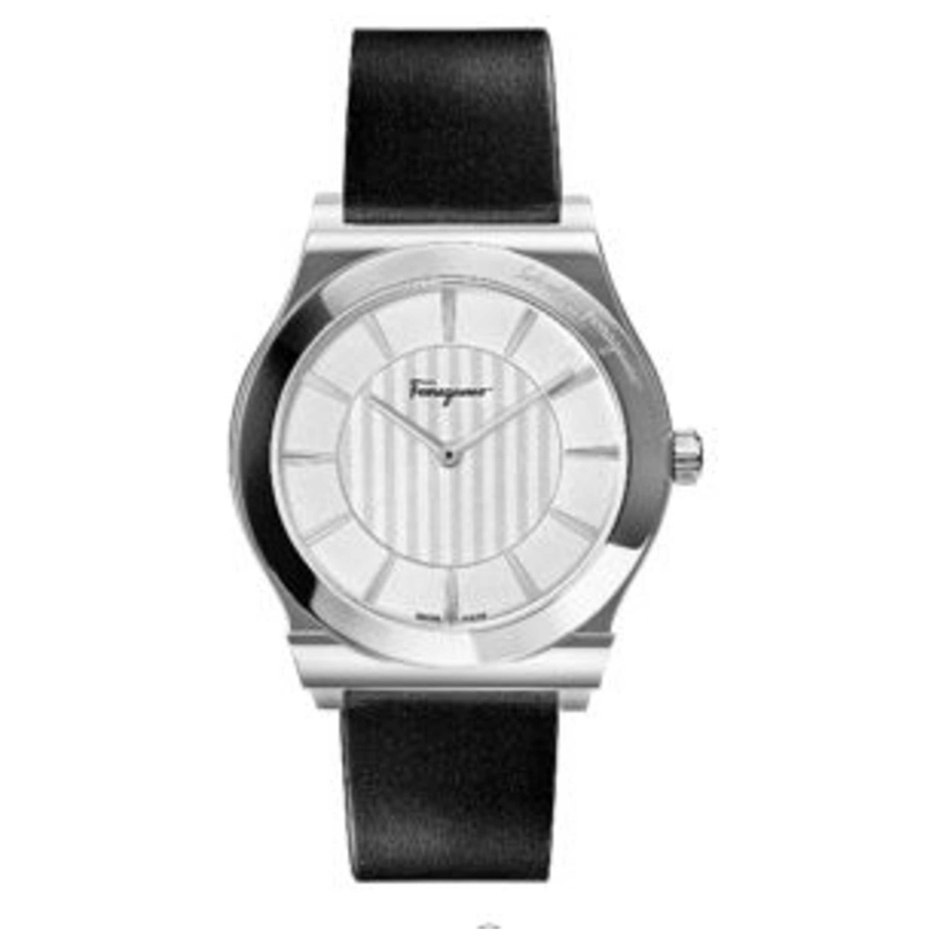 Discover timeless sophistication with the Ferragamo 1898 Slim Men's watch, a quintessential Swiss-made piece. The round 41mm stainless steel case houses a sleek silver dial protected by a scratch-resistant sapphire crystal. With Swiss-made quartz movement, you'll have a reliable timekeeper on your wrist. The watch is water resistant up to 30m, making it a practical choice for the everyday man. The classic black leather strap fastens securely with a pin buckle, merging both style and comfort in one fine wrist piece. SFPE00119
