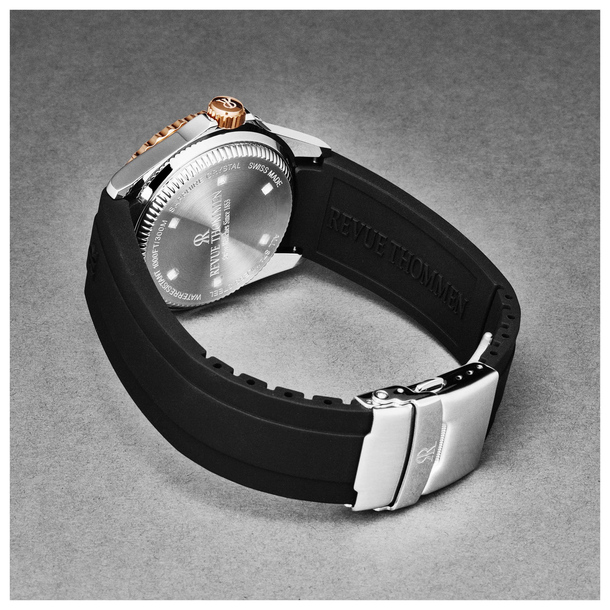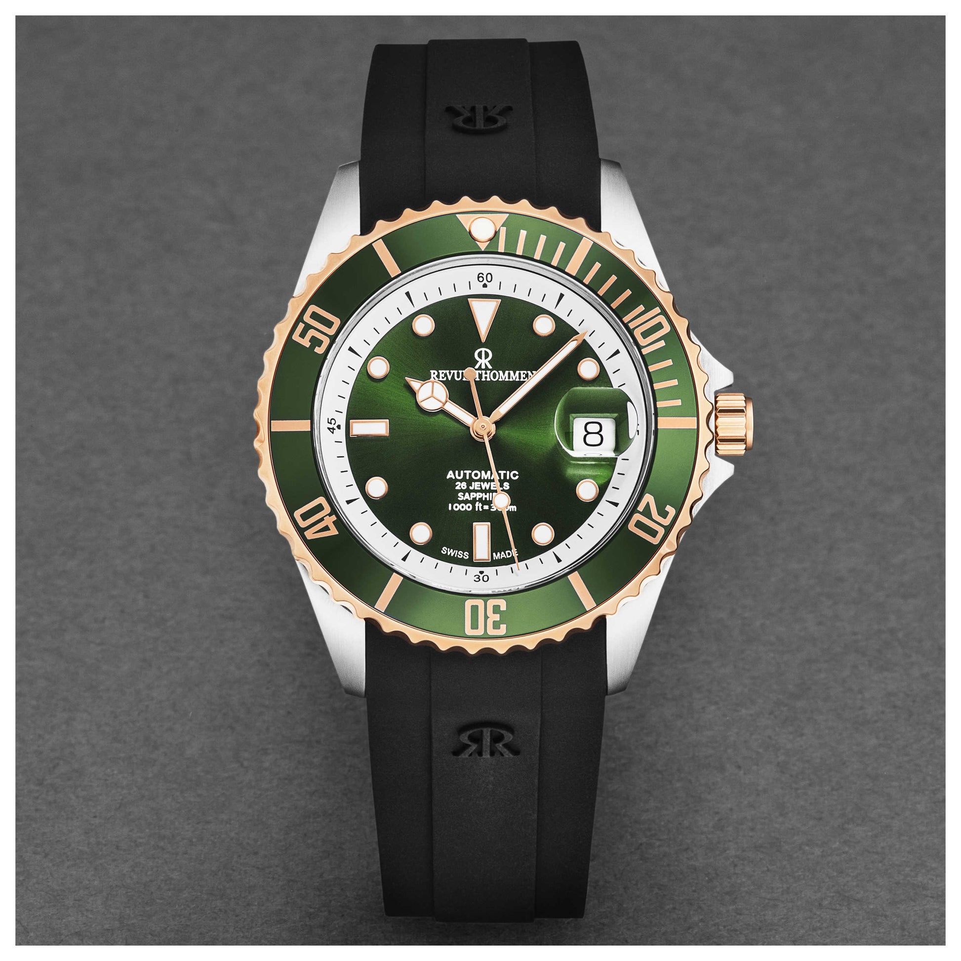 Embrace the sophistication of Swiss design with the Revue Thommen Diver watch, a robust piece for the modern man. This automatic timepiece, featuring a Sellita SW200 caliber, ensures precise timekeeping with its Swiss-made movement and convenient screw-down crown. Enclosed in a 42mm stainless steel round case with a closed back, the vibrant green dial shines under a scratch-resistant sapphire crystal. Perfect for aquatic adventures, it offers an impressive water resistance of up to 300m. The black rubber strap, secured with a deployment clasp, adds a bold touch to this remarkable wristwear. 17571.2354