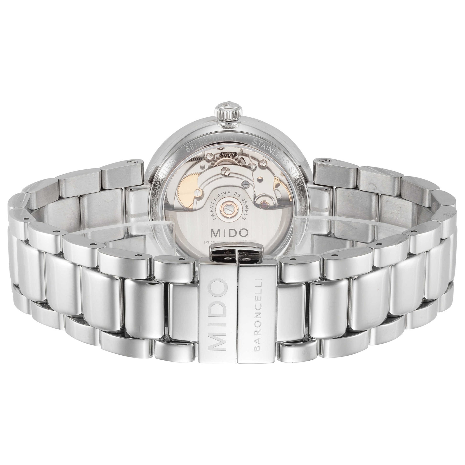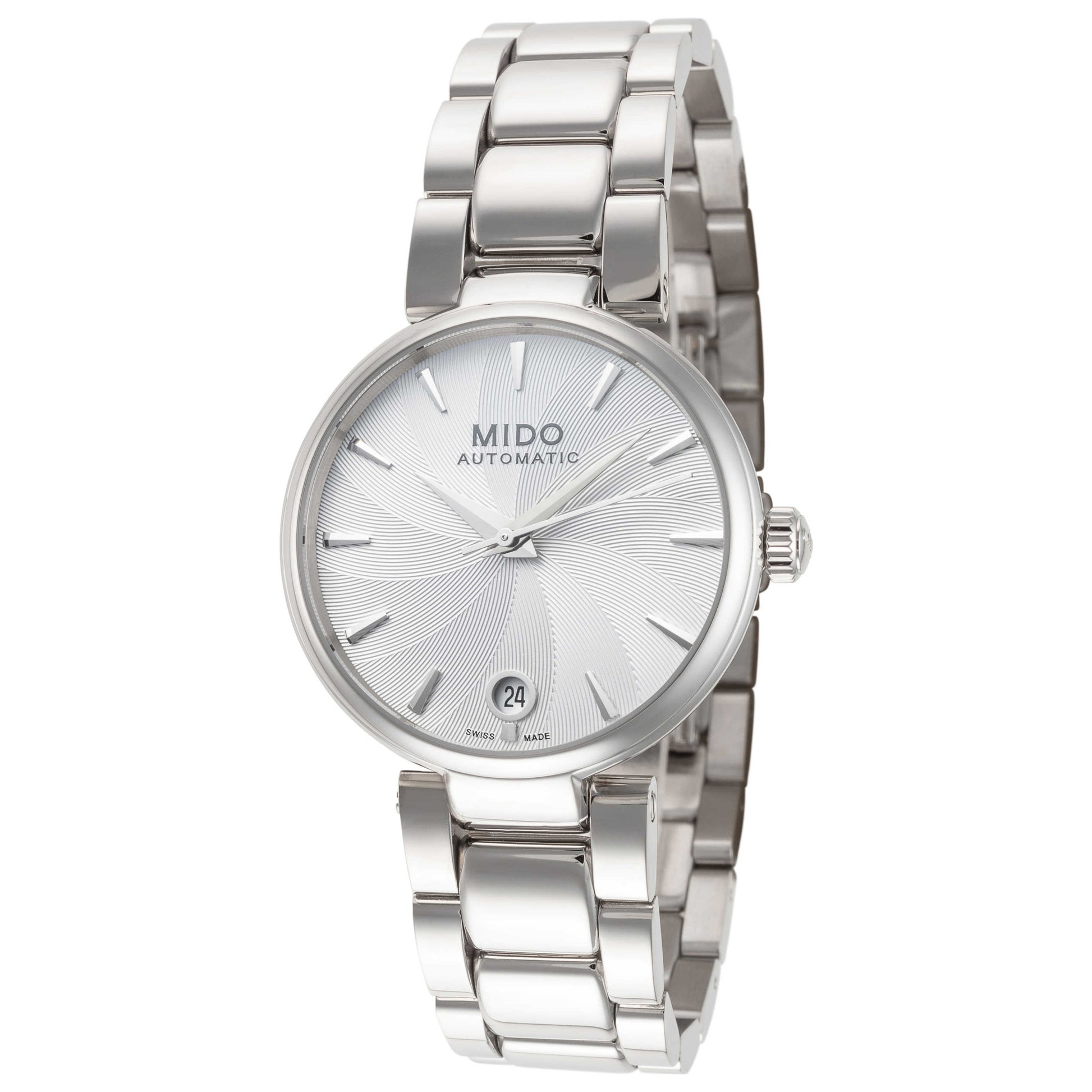 Step into elegance with the Mido Baroncelli Donna watch, a Swiss-made timepiece designed especially for women. This automatic watch, boasting Swiss-made movement, features a date display elegantly placed at 6 o'clock on a charming silver dial. Encased in a round 33mm stainless steel case, the watch offers a 100m water resistance and a glimpse into its workings with an exhibition back. The silver stainless steel bracelet adds a touch of finesse, easily secured with a deployment clasp. Show off your timeless style with this brilliant piece. M0222071103110