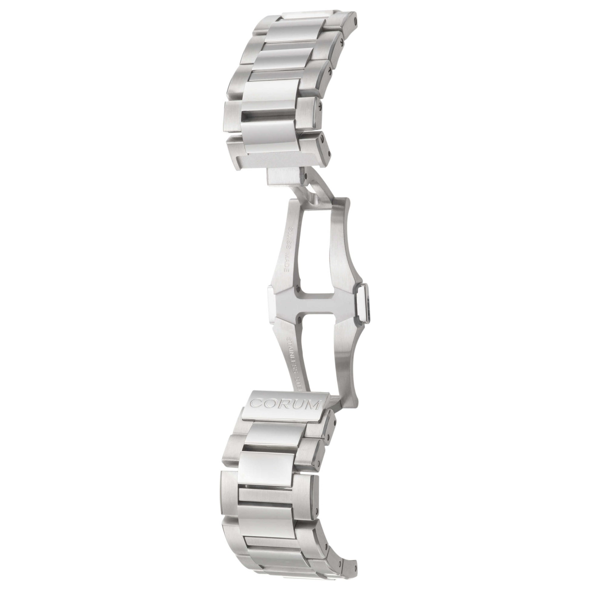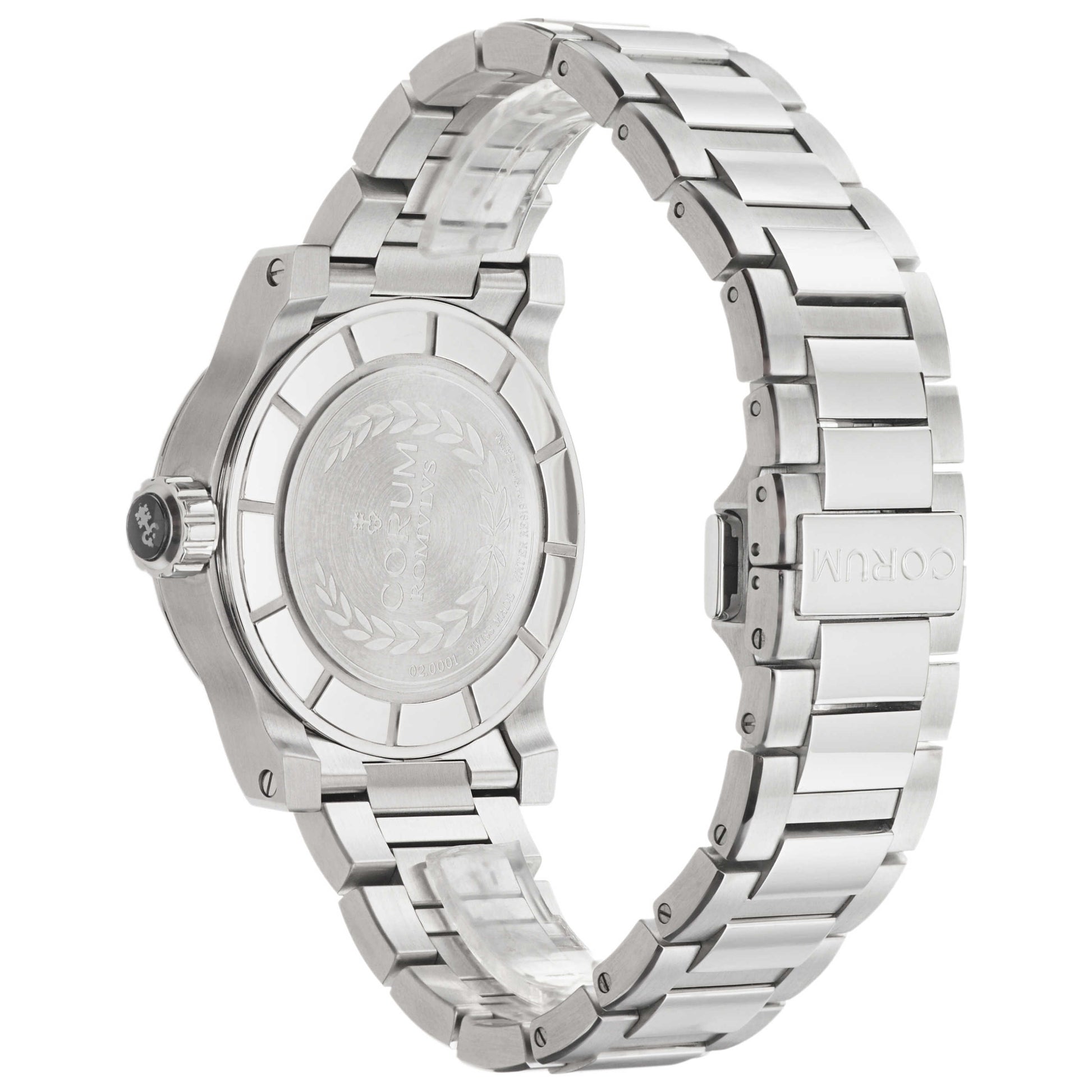 Quiet confidence. The Romulus watch 373-515-20-V810-BA65 by Corum strikes a perfect balance of substance, style and strength – for wearers with great poise.There's an air of stateliness about this watch; the face says it all. A ground-breaking concept from day it was introduced at the 1966 Basel Fair, this is the first timepiece to favor an hour-free dial and hand-engraved roman numerals on the bezel. To complement such originality and elegant simplicity, Corum has added a striking mix of gray guilloche, silver-toned hands and power reserve subdial, and a date display at 3 o'clock. Then there is the case. Crafted in stainless steel, with the bracelet to match, it comes with a double-curve shape that is instantly recognizable to collectors and watch enthusiasts; Romulus through and through. Few brands can say they've changed the world of watchmaking as much as Corum. In a long and diverse line of original designs and high-quality craftsmanship, the Romulus watch 373-515-20-V810-BA65 by Corum is right at home.