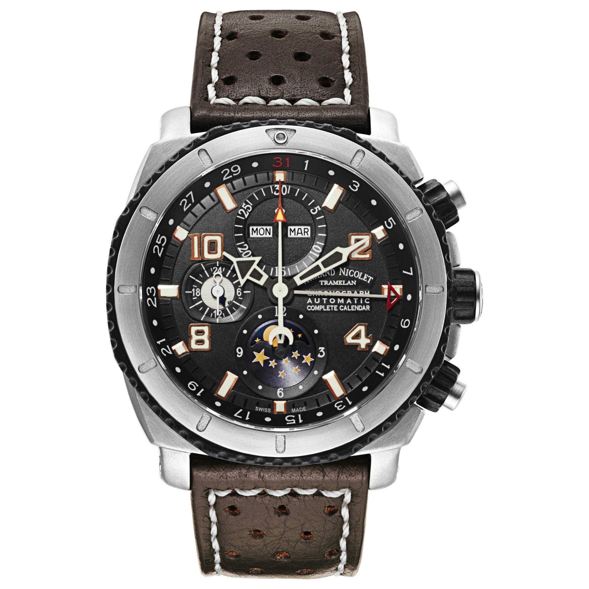 Armand Nicolet, S05 Chronograph & Complete Calendar, Men's Watch, Titanium Case, Leather Strap, Swiss Mechanical Automatic (Self-Winding), T618A-NS-P160TM4
