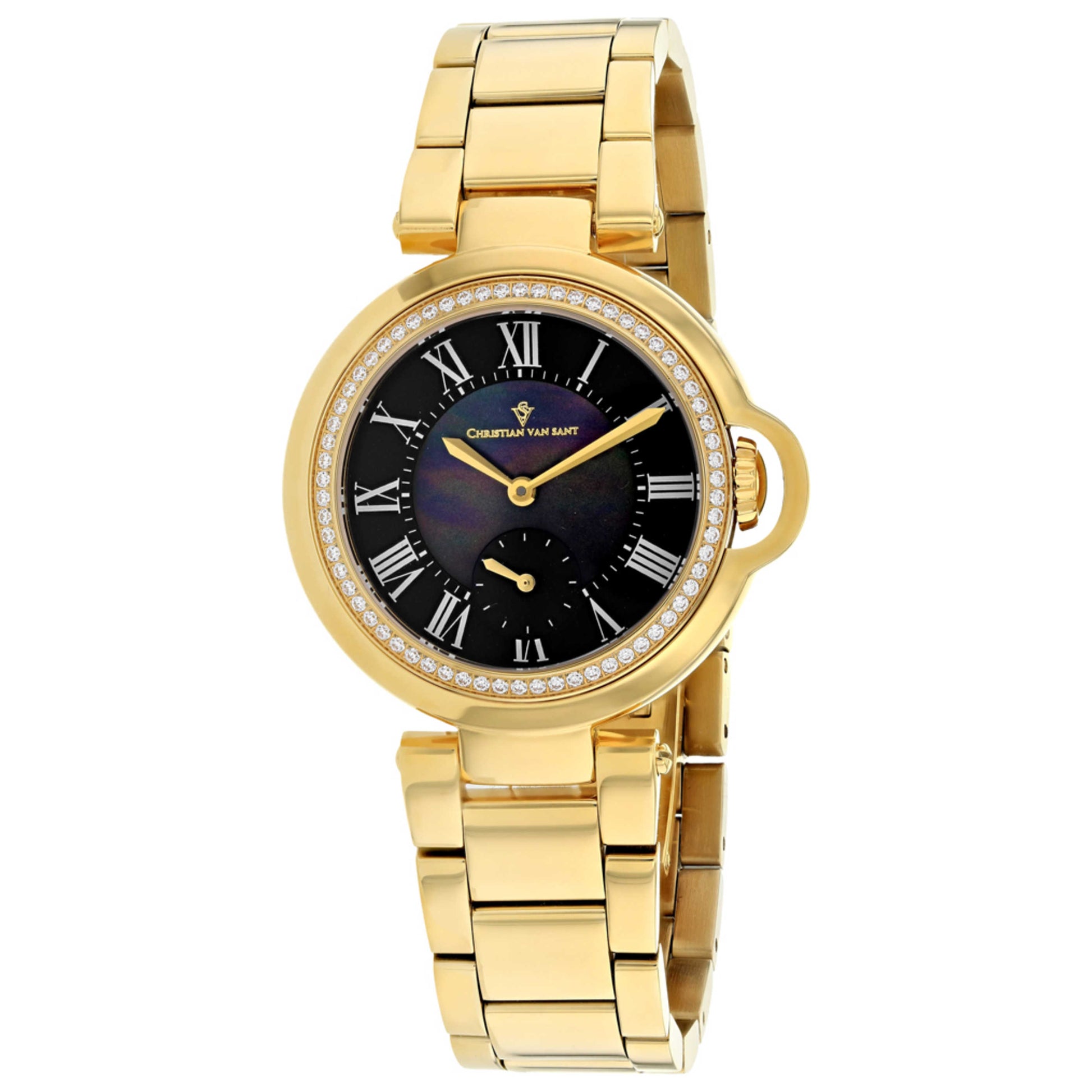 Indulge in the elegance of the Christian Van Sant Cybele watch, an exquisite piece designed for the sophisticated woman. This round quartz timepiece features a 35mm stainless steel case adorned with a captivating black dial, protected under durable mineral crystal. The pull and push crown facilitates easy time adjustment. With a water resistance of up to 30m, it is prepared for everyday wear. The gold stainless steel bracelet, with its secure deployment clasp, enhances the watch's overall appeal while ensuring comfort. Enjoy the added convenience of a date feature, making this watch as practical as it is stylish. CV0235