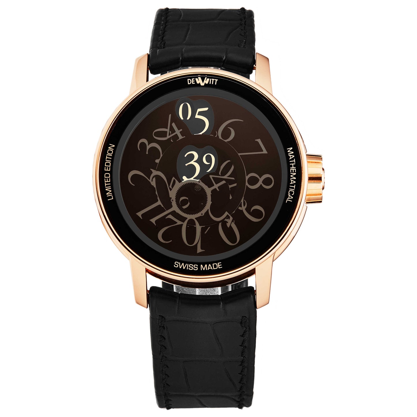 Discover precision and luxury with the DeWitt Academia Mathematical watch, a Swiss-made masterpiece for men. Its automatic movement, housed in a 42.5mm 18K rose gold round case, assures unerring timekeeping. Protected by scratch-resistant sapphire crystal, the fixed bezel encases a captivating black dial. The watch's leather strap, in a sleek black, secures with a deployment clasp. The water resistance of up to 30m offers resilience, maintaining the elegance of this timepiece even in challenging conditions. AC.MAT.001