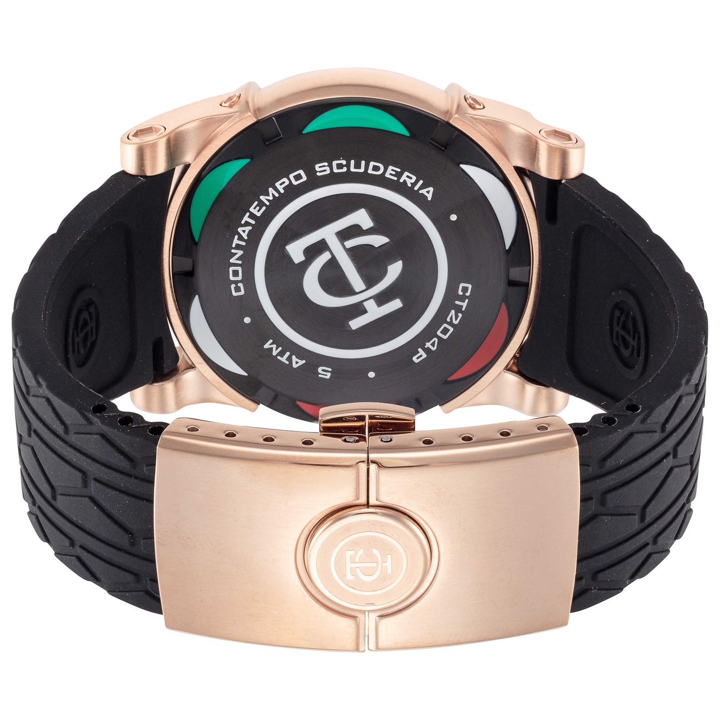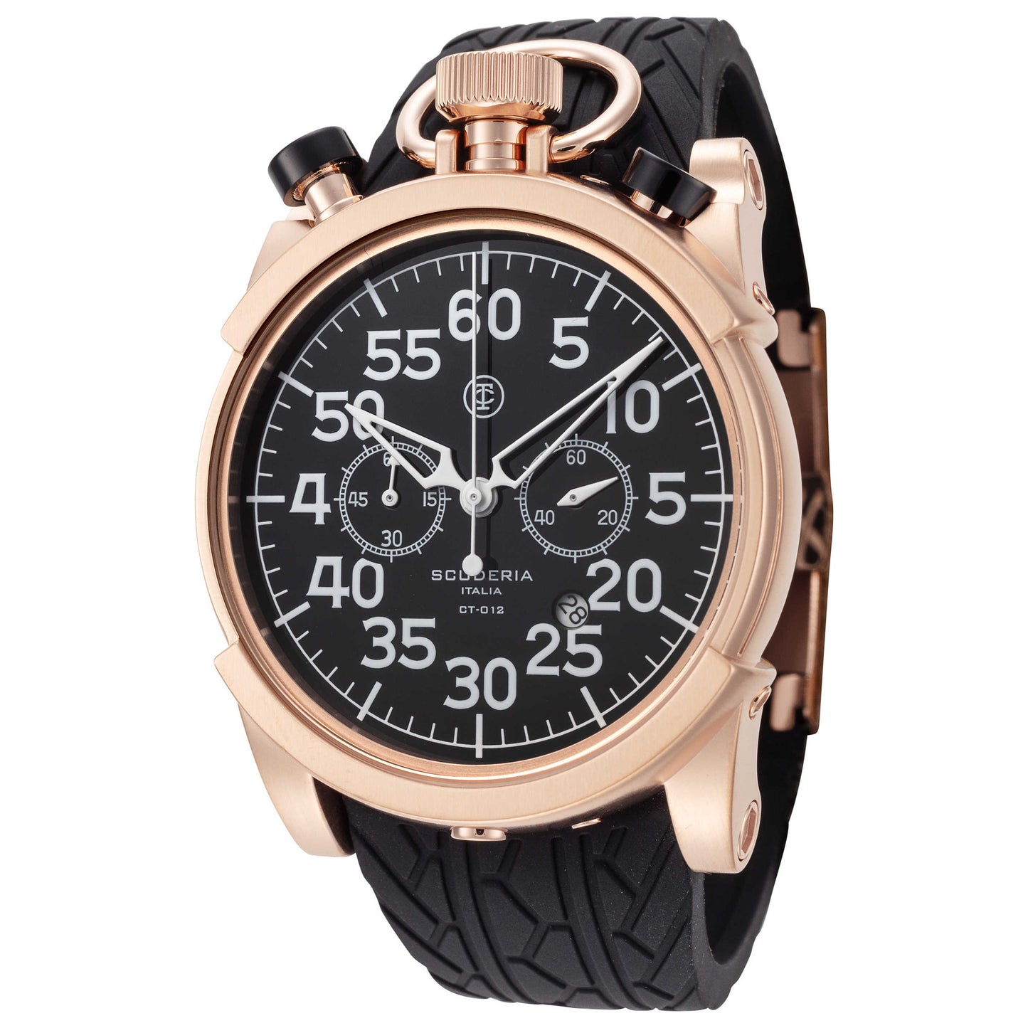 The CT Scuderia Corsa men's quartz watch will make a stylish and reliable addition to any collection. It features an impressive Japanese-made Miyota 0S11 movement with a screw-down crown, chronograph functions, and 50 m (165 feet) water resistance. The case is round in shape and made of stainless steel, complemented by the mineral crystal face for added durability. Its closed back ensures protection while its 44 mm size makes it comfortable to wear on your wrist day or night; plus, a black silicone strap with deployment clasp fastening completes the look perfectly.