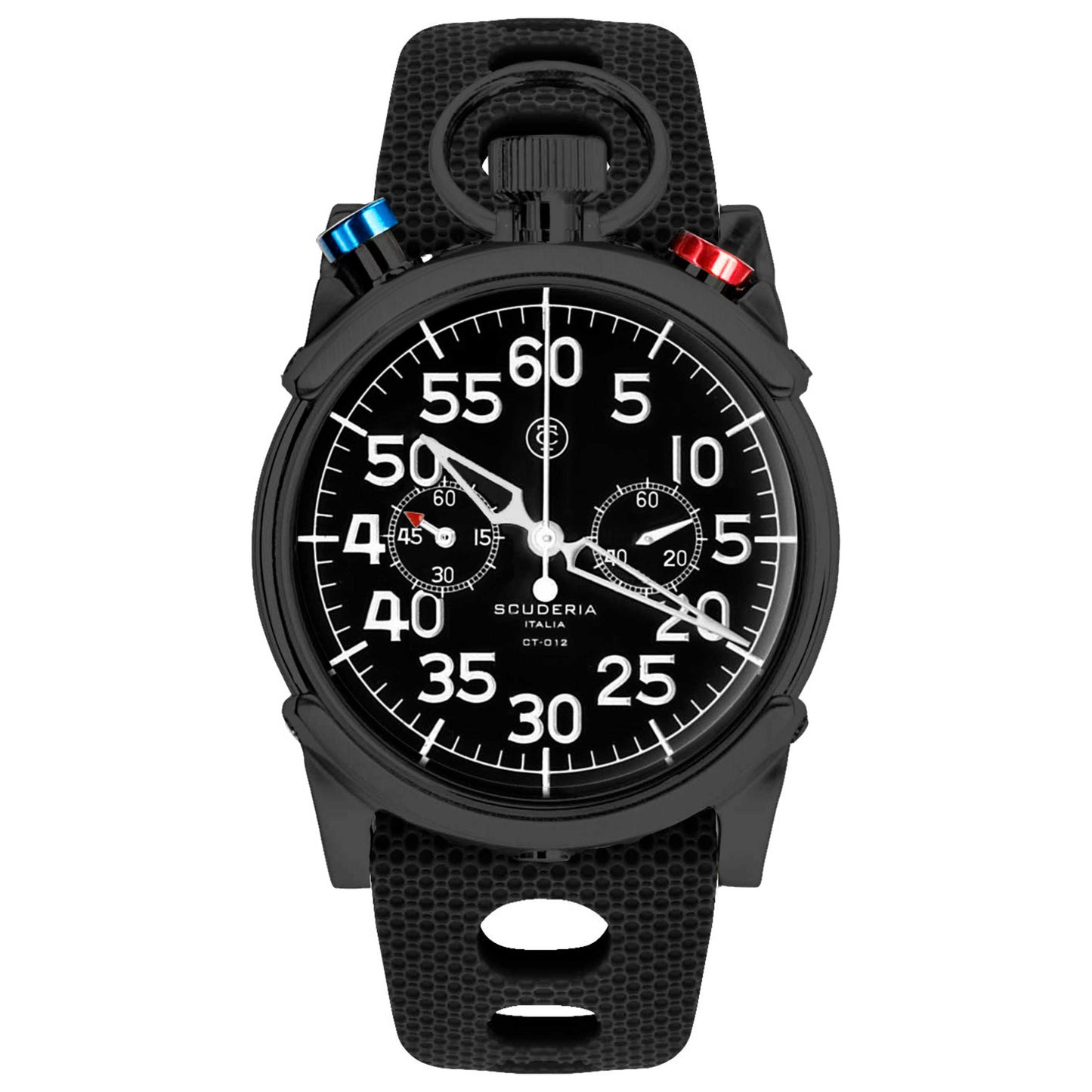 The CT Scuderia Corsa men's quartz watch is a stylish and dependable timepiece. It features a round stainless steel case with mineral crystal, closed case back, and 44 mm diameter that offers 50 m (165 feet) of water resistance. The movement is a Japanese-made Miyota 0S11 quartz chronograph with screw-down crown for added protection. A black dial showcases the classic pin buckle closure on the accompanying black silicone strap for optimal comfort and style.