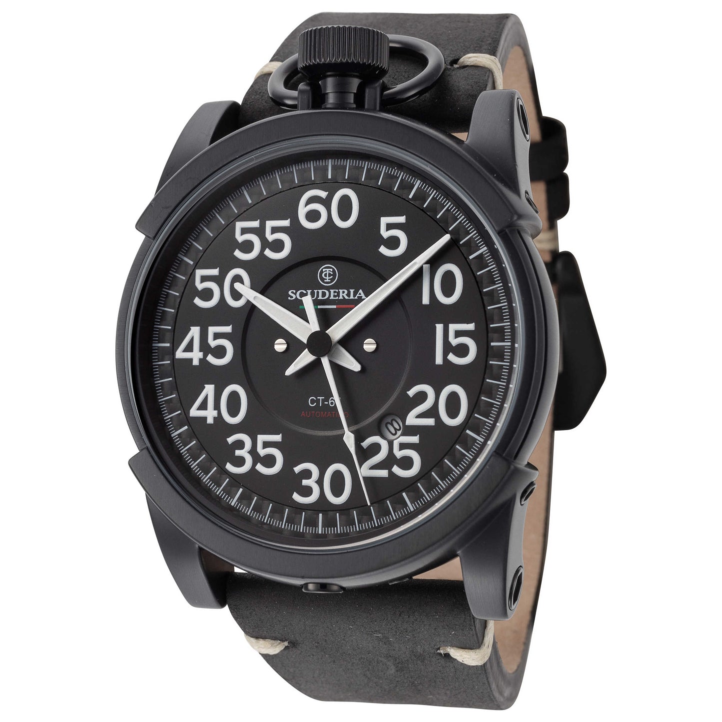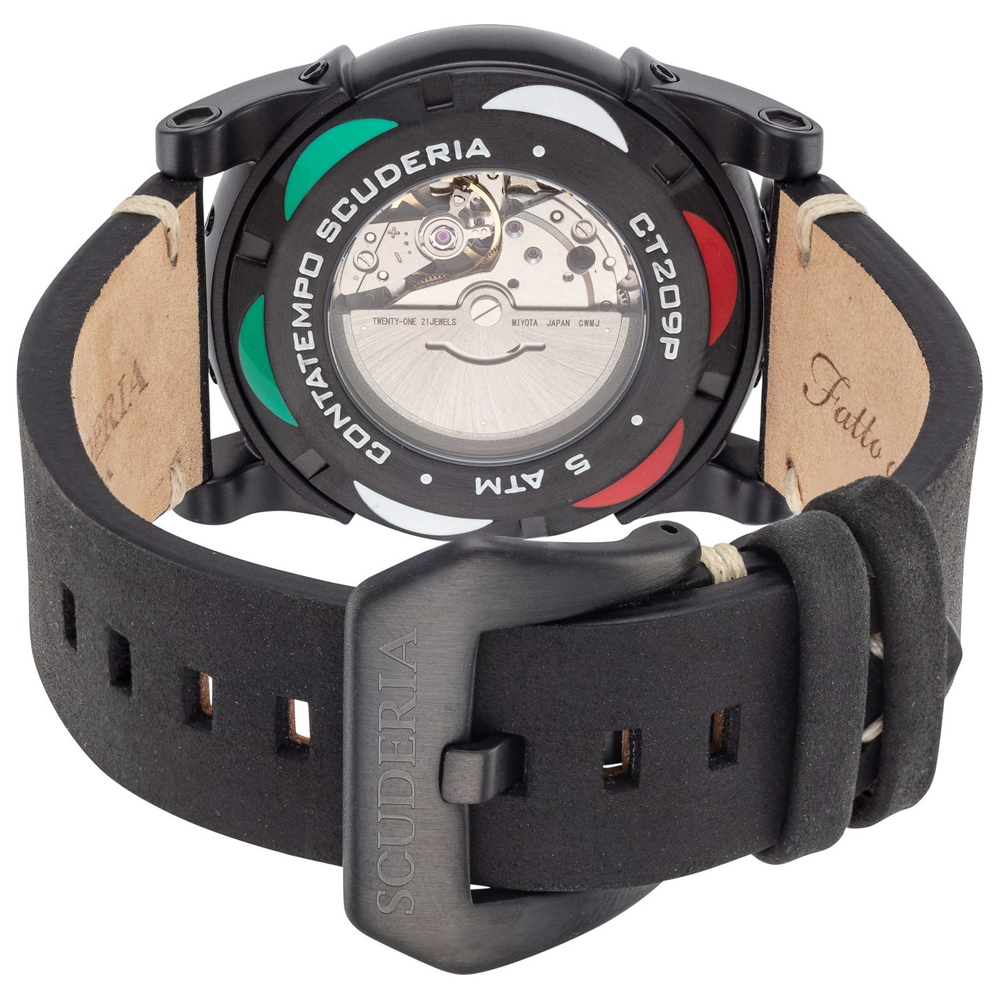 Indulge in the sleek design of the CT Scuderia Corsa Automatico watch, a must-have accessory for stylish men. With a black PVD stainless steel round case measuring 44mm, this watch is powered by a Japanese Miyota 9015 automatic movement that boasts a 42-hour power reserve. Its black dial is safely tucked under a durable mineral crystal, and the watch showcases a screw-down crown and an exhibition back. Designed for rugged use, this timepiece offers 50m water resistance. To complete the look, the watch comes with a black silicone strap secured by a pin buckle, perfect for any occasion. CT-209-P