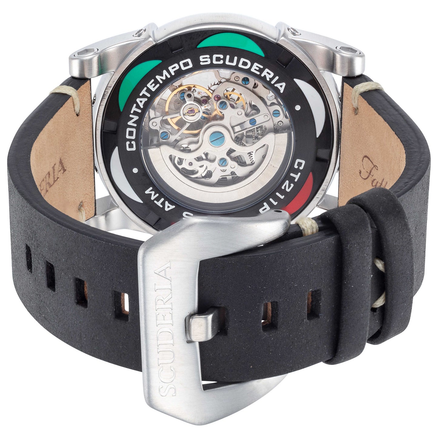 Introducing the CT Scuderia Corsa Automatico, a unique timepiece specifically crafted for men who value style and functionality. This automatic watch, with a Miyota 8N40 movement, boasts a remarkable power reserve of 42 hours. Made in Japan, this sophisticated piece features a sturdy round 44mm stainless steel case, an intriguing skeleton dial, and an exhibition case back. The watch's screw-down crown and water resistance up to 50m make it a robust companion. The black leather strap adds a touch of finesse and ensures a snug fit with a pin buckle clasp. The mineral crystal enhances durability while retaining an elegant look. CT-211-P