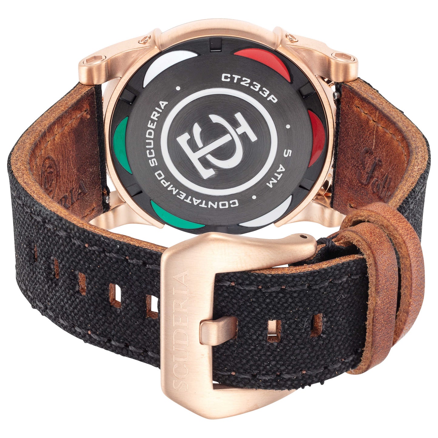 The CT Scuderia Saturno men's quartz watch is a great addition to any wardrobe. Featuring a chronograph and Japanese-made Miyota 0S11 movement with a screw-down crown, it is both stylish and reliable. With a round case made of stainless steel, mineral crystal for the case crystal, closed back, and 44 mm in size; this watch has an impressive water resistance rating of 100 m (330 feet). The black dial combined with green leather strap secured by pin buckle completes its sleek look.