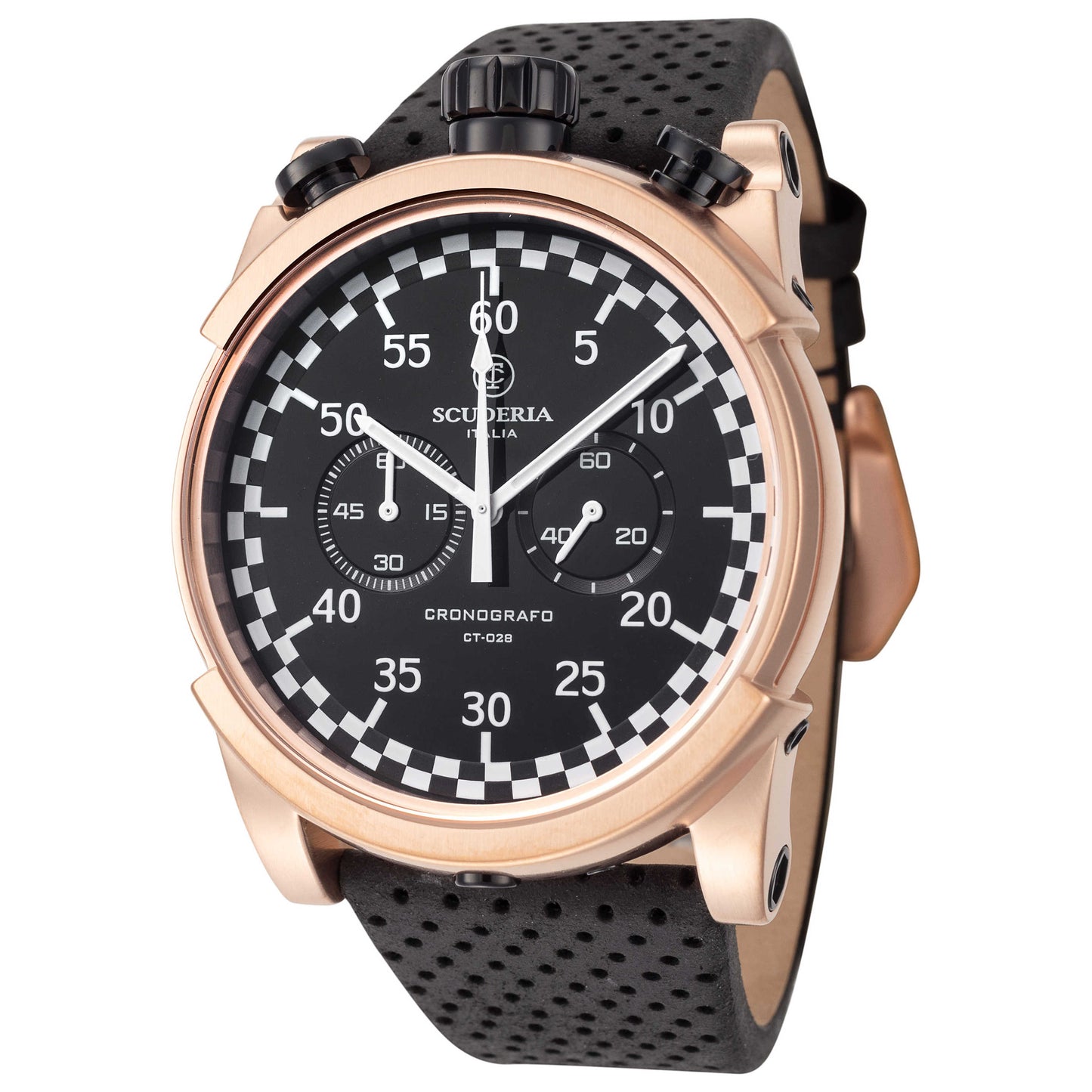 Experience unparalleled sophistication with the CT Scuderia Saturno watch, a quintessential accessory for the discerning man. Driven by a made in Japan Miyota 0S11 quartz movement, this timepiece boasts a round 44mm stainless steel case and a screw-down crown ensuring enhanced durability. The black dial, visible through a protective mineral crystal, accentuates the watch's sleek design. This chronograph's solid case back and 50m water resistance testify to its robustness. The black leather strap with a pin buckle lends a masculine charm while securing the watch comfortably. Choose Saturno for a blend of style and function. CT-237-P
