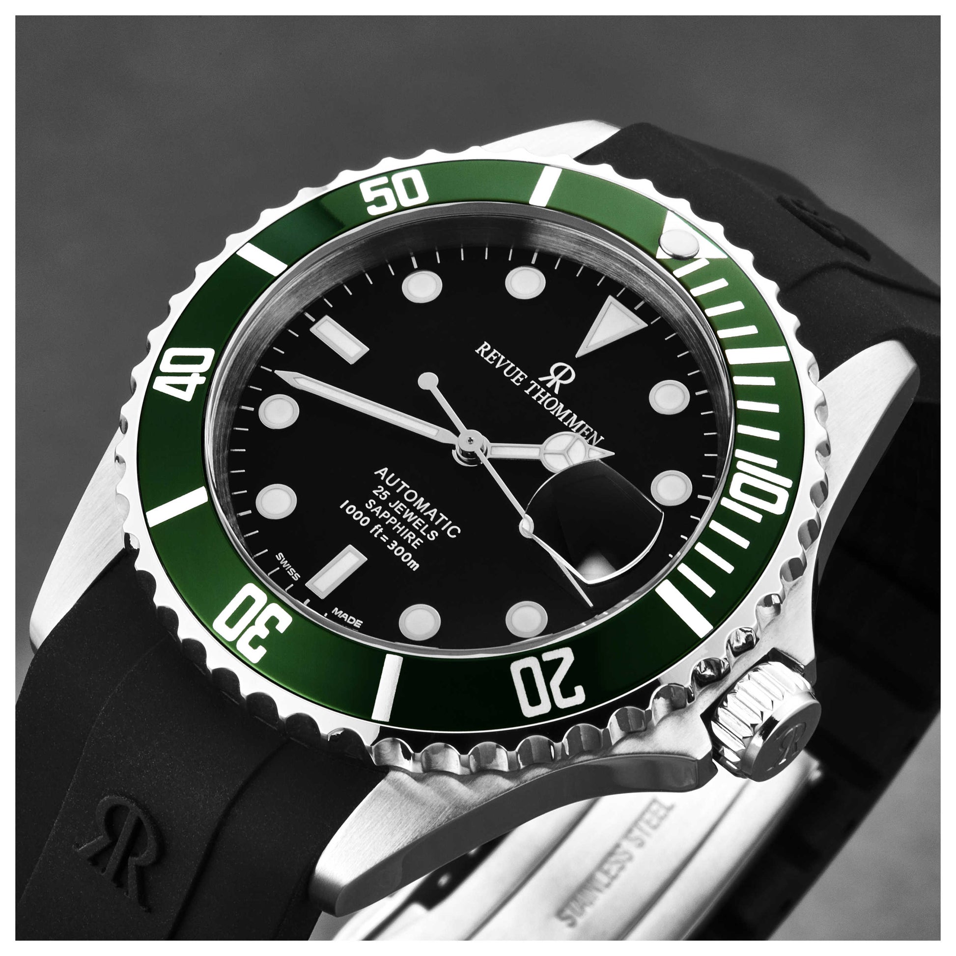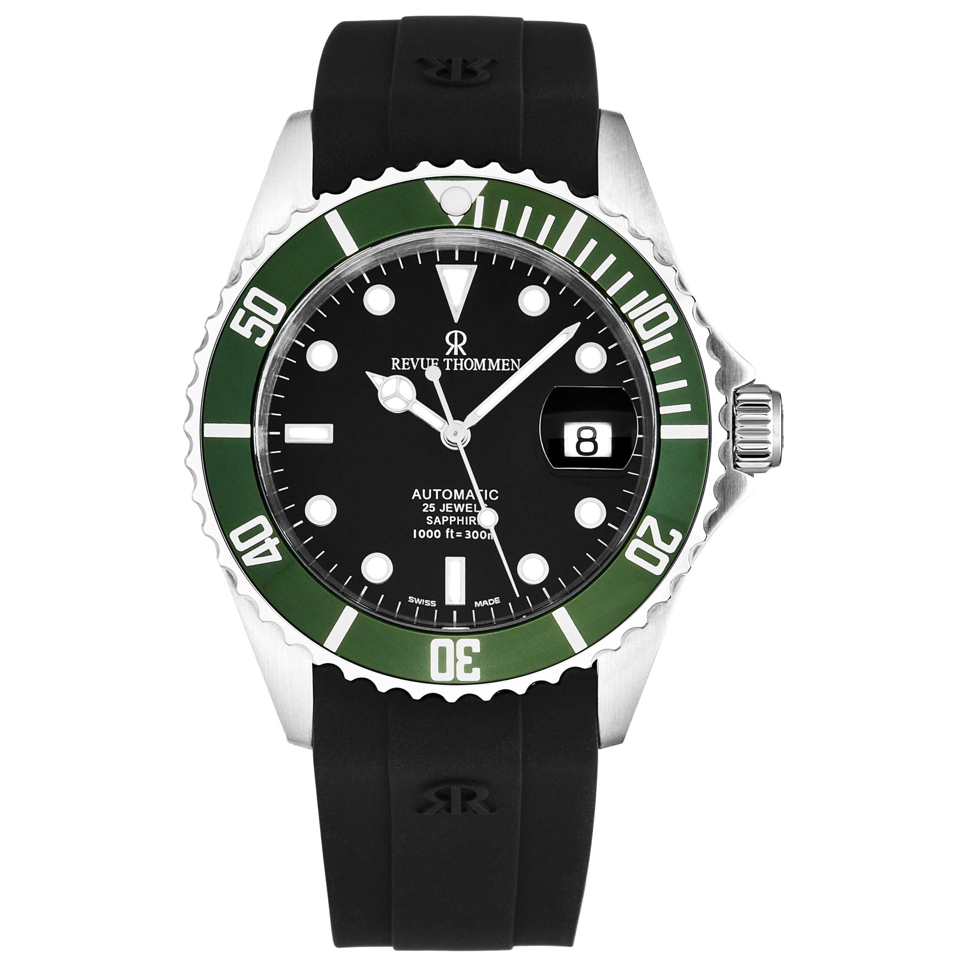 Showcase your style with the Revue Thommen Diver watch, a sophisticated timepiece for the modern man. This Swiss-made automatic watch, with a powerful SW200 caliber, has a remarkable 38-hour power reserve and a durable screw-down crown. The round 42mm stainless steel case, with its scratch-resistant sapphire crystal, encloses a bold black dial. With a water resistance of up to 300m, it's perfect for the adventurous gentleman. The comfortable black rubber strap, equipped with a deployment clasp, adds a touch of rugged elegance. This watch also features a date function for added convenience. 17571.2834