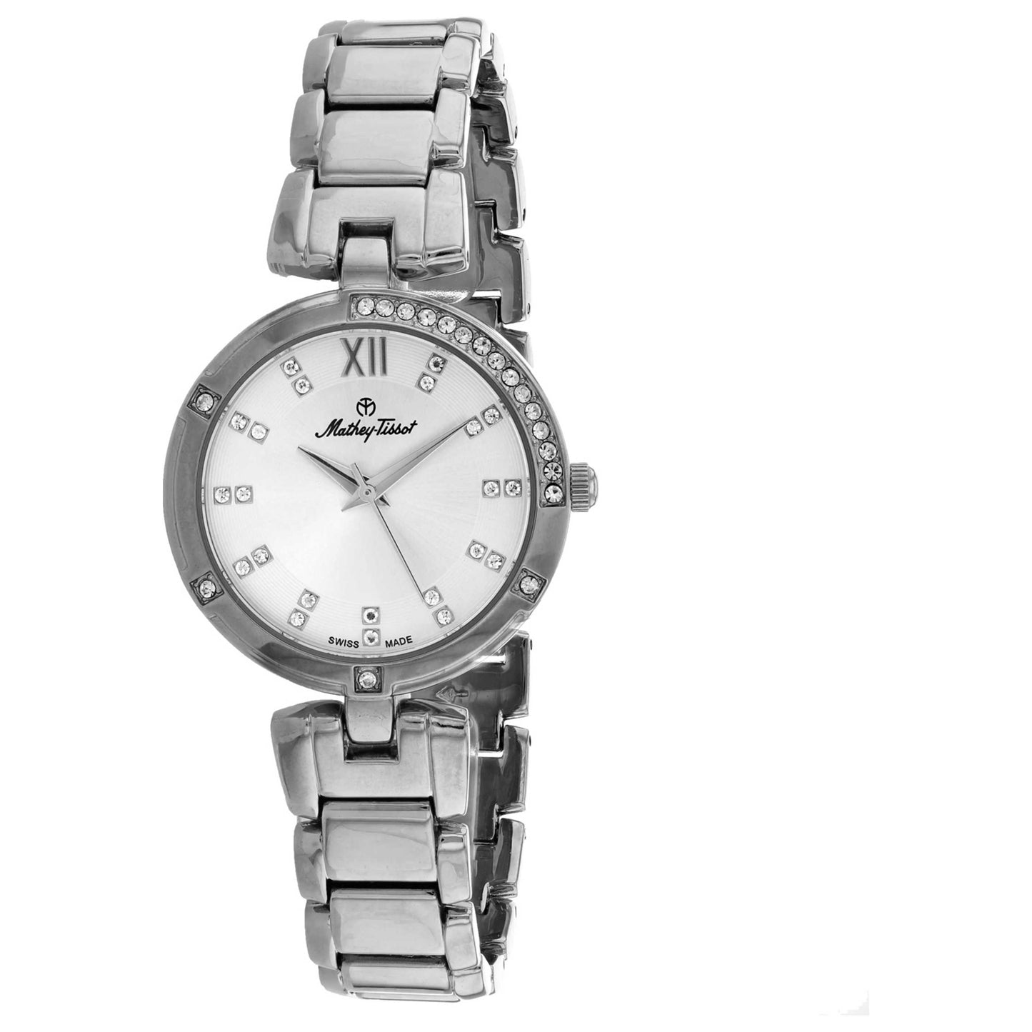 Introducing the Mathey Tissot Classic women's watch, a timeless Swiss-made accessory exuding elegance. This round, quartz movement timepiece features a sleek 30mm stainless steel case, framing a beautiful silver dial. Protected by scratch-resistant sapphire crystal, it sports a pull and push crown for ease of use. Resistant to water up to 50m, this piece boasts impressive durability. The silver stainless steel bracelet adds to its sophistication and secures with a jewelry clasp, offering both style and comfort in one exquisite package. D2583AI