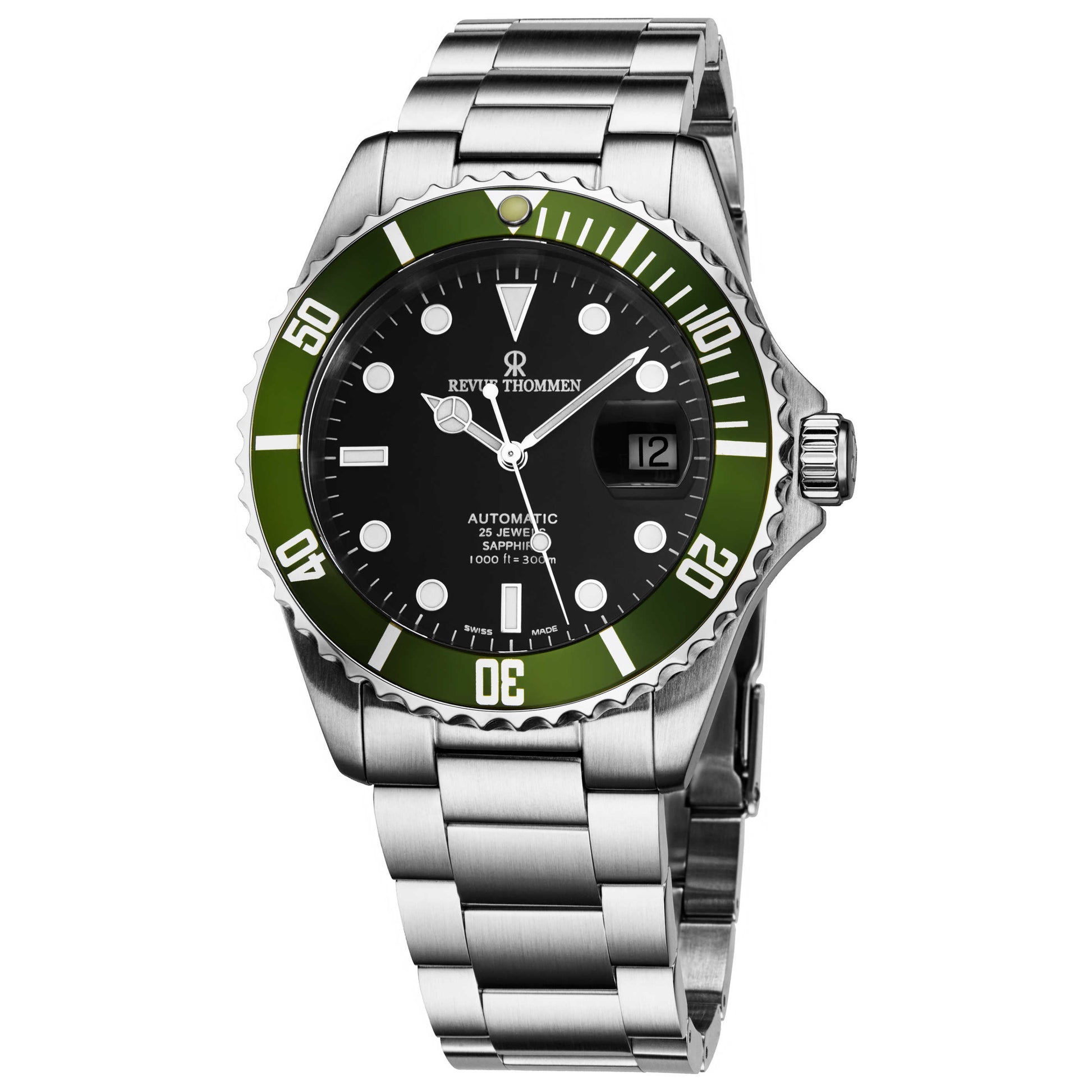 Experience the superior Swiss craftsmanship of the Revue Thommen Diver men's watch. Built for the adventurous man, this automatic timepiece features a robust stainless steel case with a 42mm diameter, ensuring durability. Its black dial is safeguarded by a scratch-resistant sapphire crystal. Thanks to its exceptional 300m water resistance, this watch is suitable for serious surface water sports and professional marine activity. The silver stainless steel bracelet, equipped with a deployment clasp, offers a comfortable fit. Trust in this Swiss-made masterpiece for unparalleled precision and style. 17571.2134