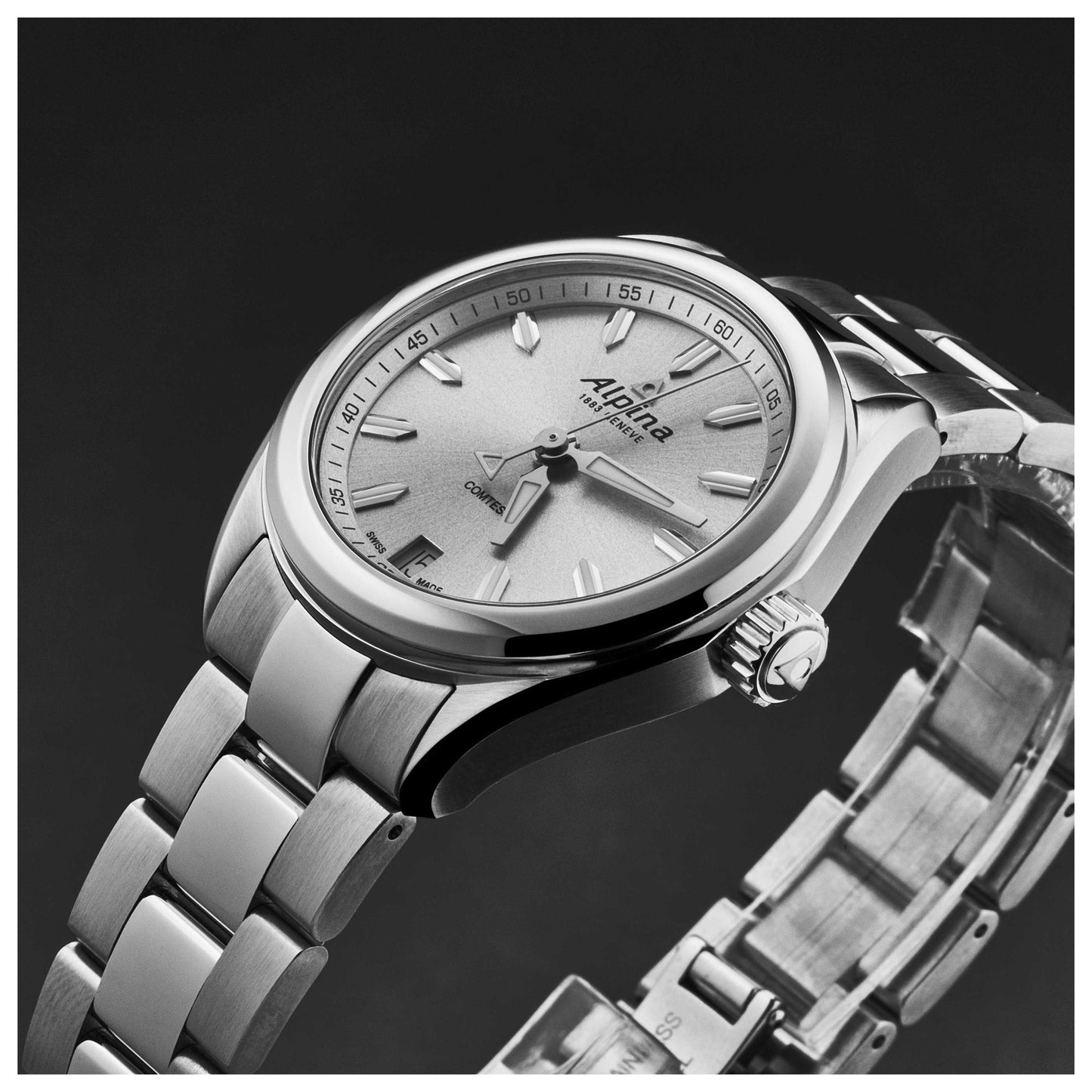 Make a statement with the Alpina Comtesse Women's Watch, crafted with precision in Switzerland. This quartz movement timepiece features a scratch-resistant sapphire crystal and a robust stainless steel case measuring 34mm. Boasting a vibrant purple dial with a date function, and a sleek silver stainless steel bracelet with a deployment clasp, this watch ensures elegance and functionality. Designed for the dynamic woman, it's water-resistant up to 100m, blending sophistication with resilience. Perfect for both formal and everyday wear, the Comtesse enhances every moment. AL240LP2C6B