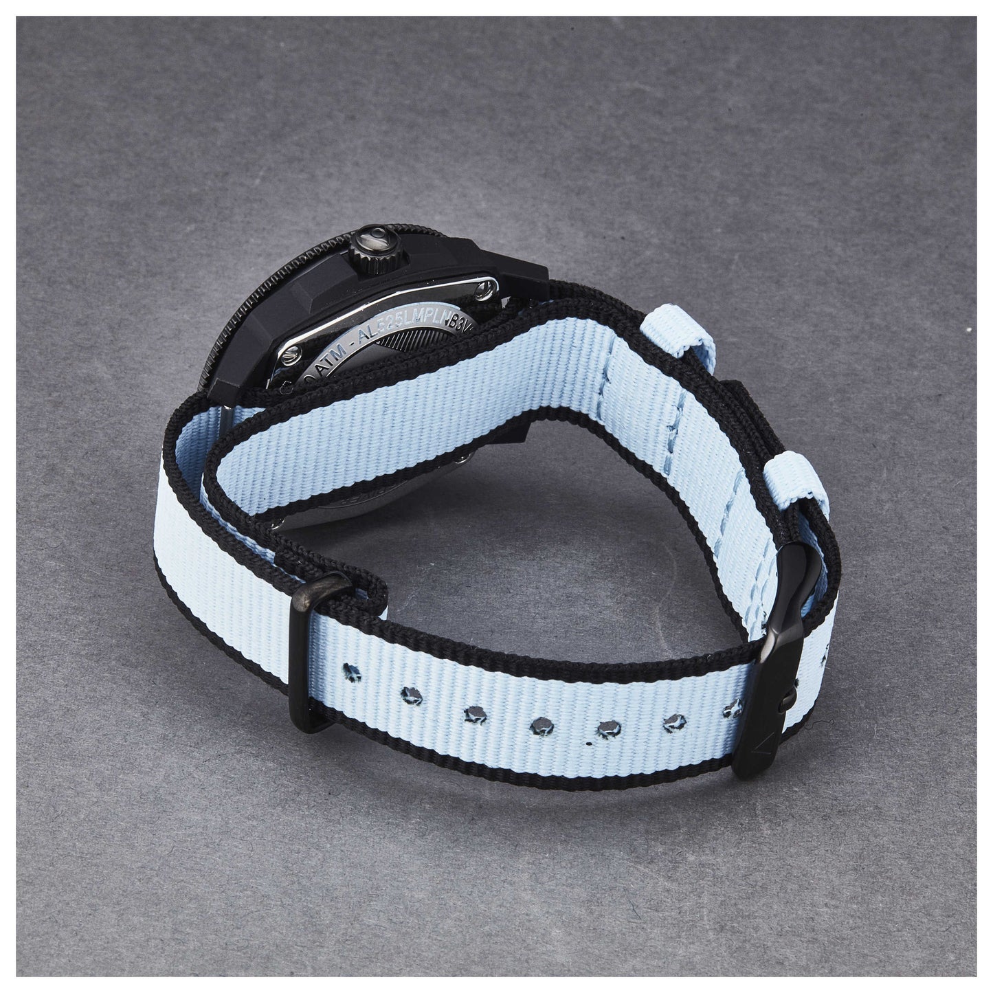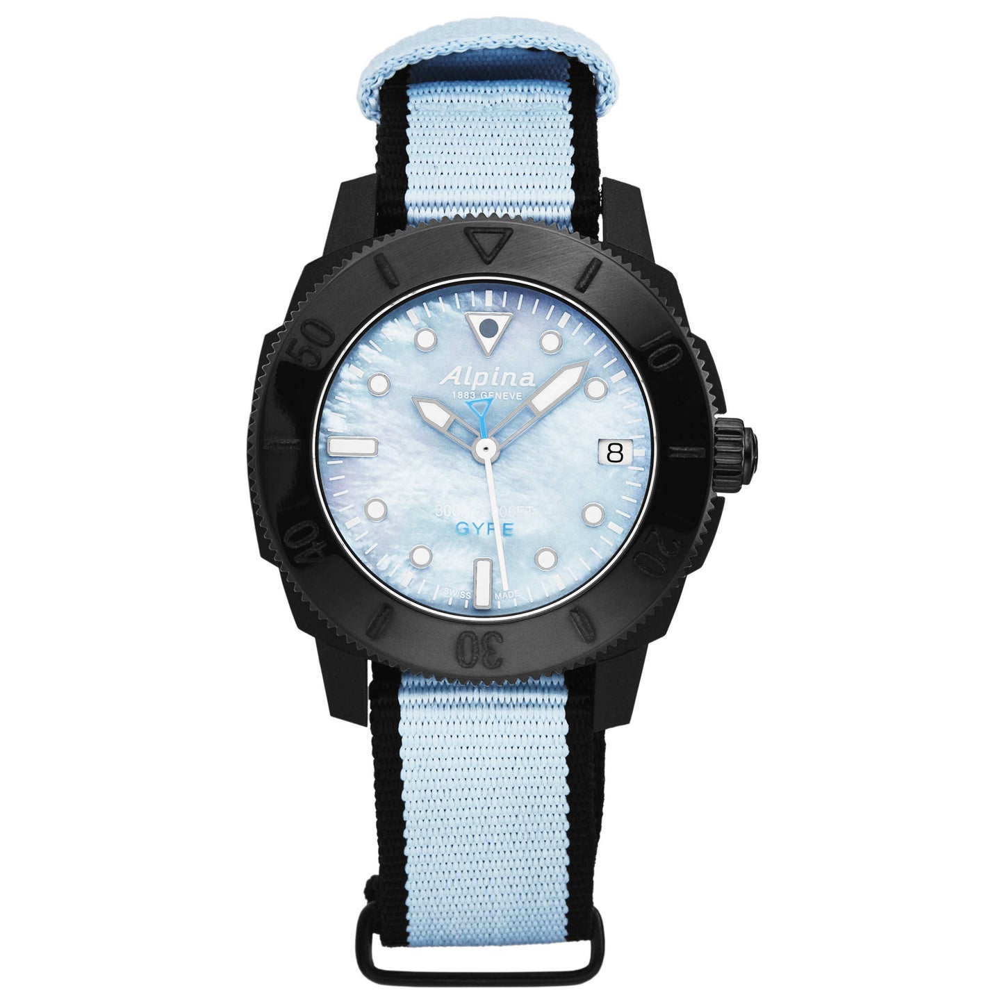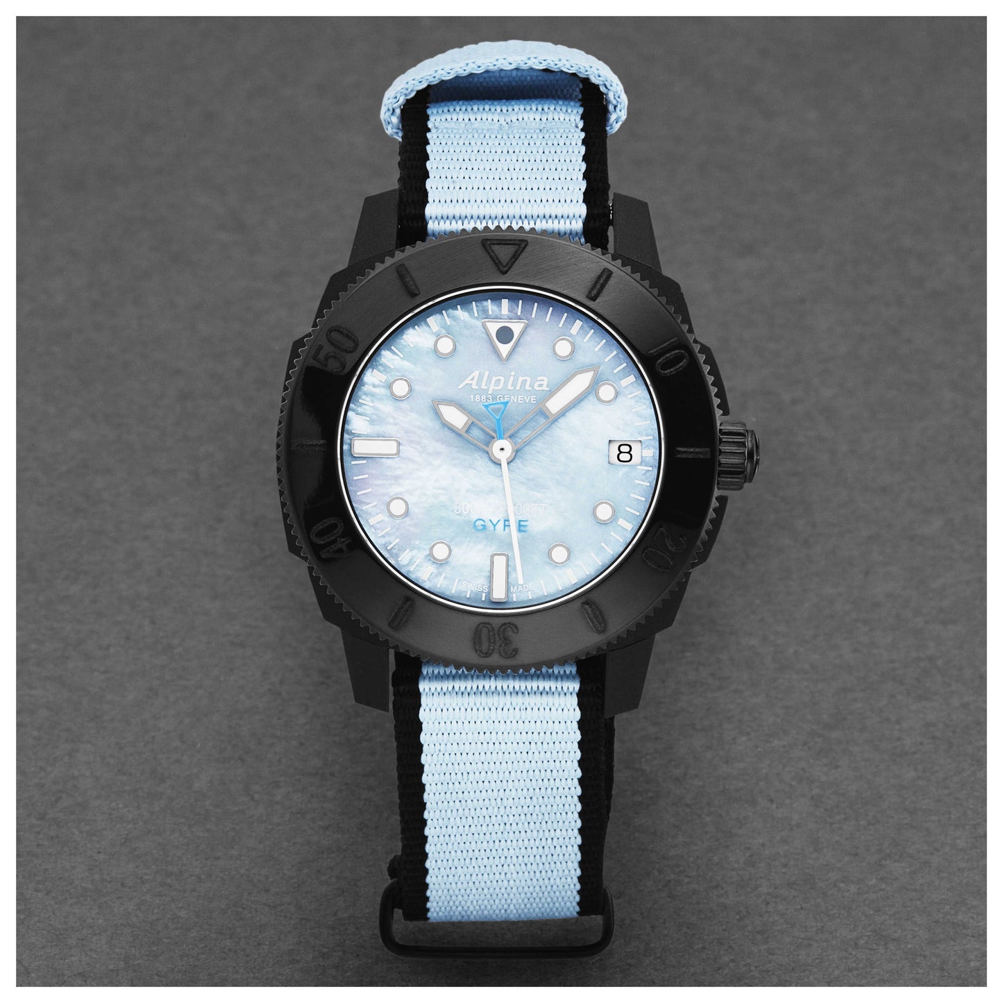 Discover the Alpina Seastrong Diver, a watch crafted with the modern, adventurous woman in mind. Swiss-Made with an automatic movement, this timepiece features a durable, round 36mm stainless steel case with a closed back. Protected by scratch-resistant sapphire crystal, the blue mother-of-pearl dial is highlighted with a practical date feature. The watch is fitted with a comfortable blue canvas strap that secures with a pin buckle. Engineered for precision and durability, it boasts a 300m water resistance and a screw-down crown. Originating from Switzerland, this watch embodies superior craftsmanship and style. AL525LMPLNB3VG6
