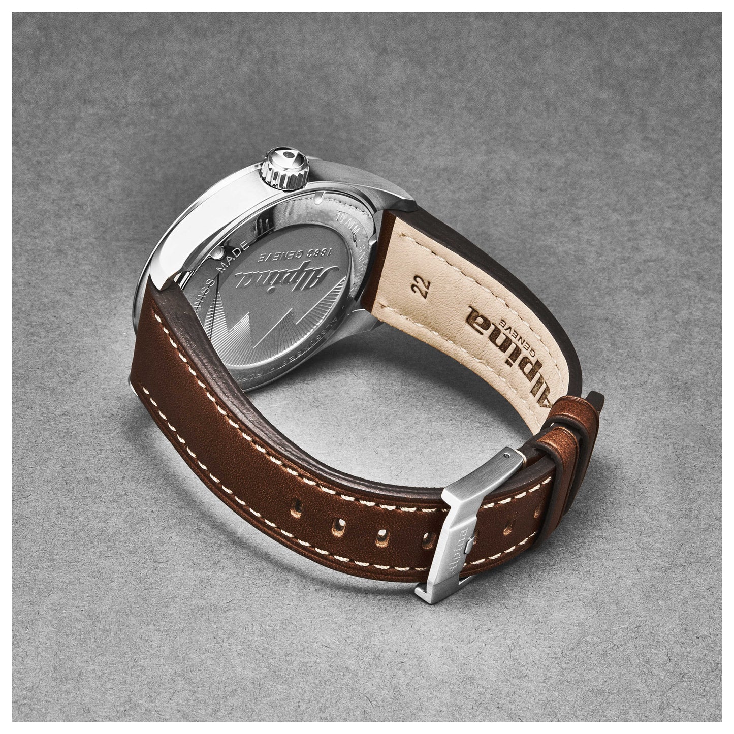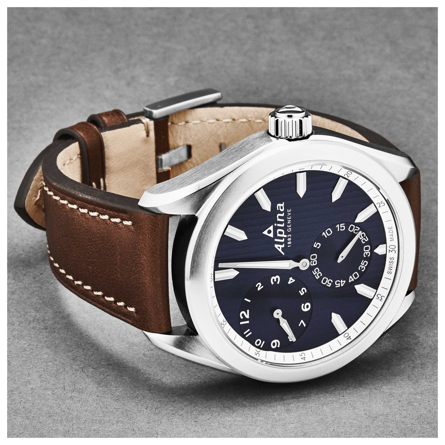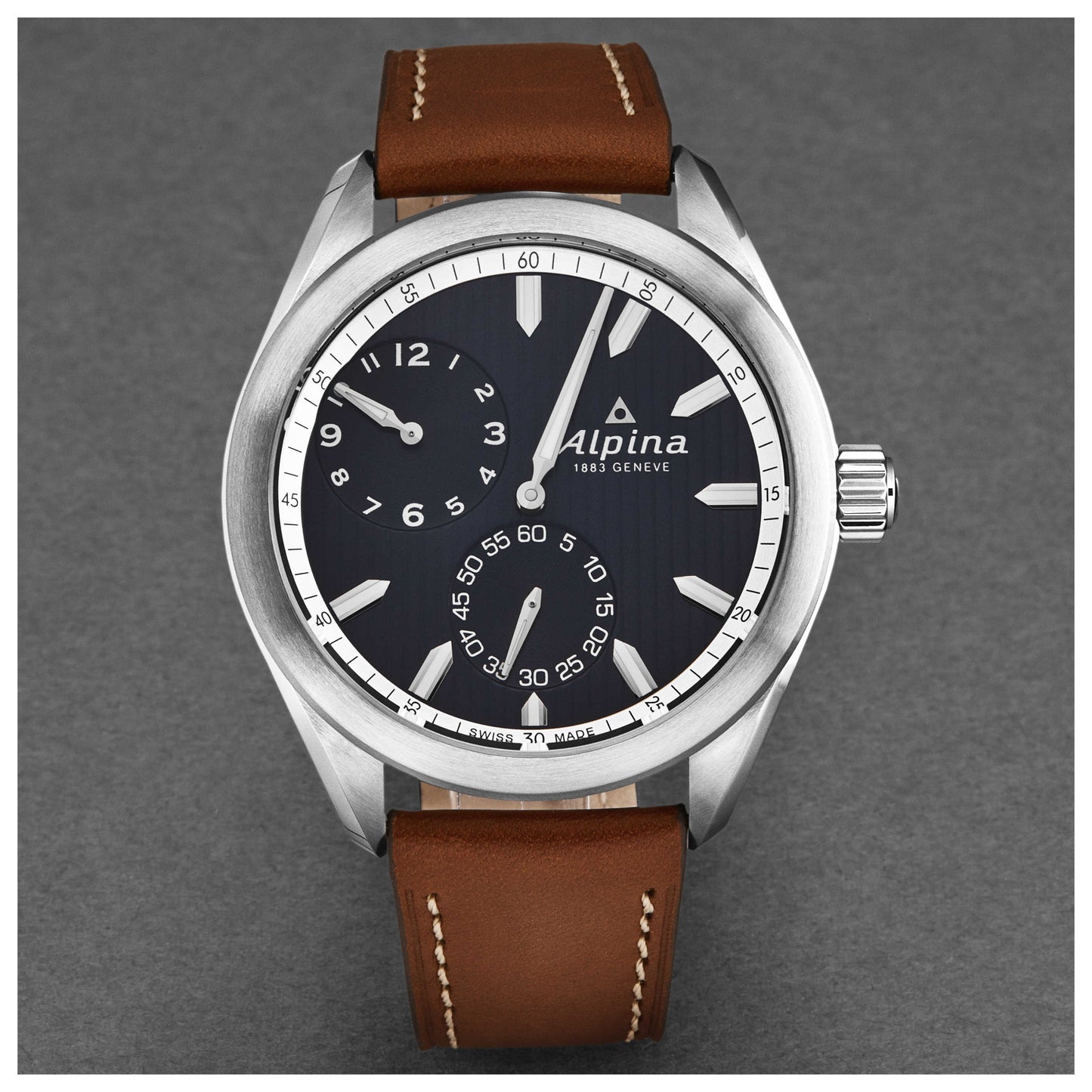Experience the elegance of Swiss engineering with the Alpina Alpiner men's watch. Designed and assembled in Switzerland, this automatic timepiece is equipped with a power reserve of 38 hours, guaranteeing continuous functionality. Its 45mm round stainless steel case holds a stunning blue dial, visible through a scratch-resistant sapphire crystal. The screw-down crown and closed back ensure a water resistance of up to 100m. This timepiece comes with a sophisticated brown leather strap, fastened securely with a pin buckle. Delve into the world of style with this unique blend of design and performance. AL650NNS5E6