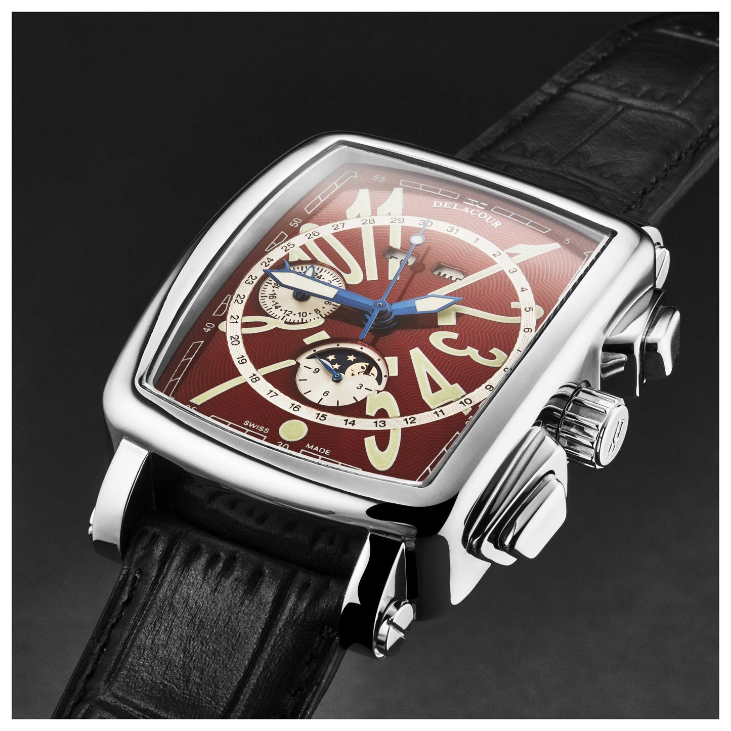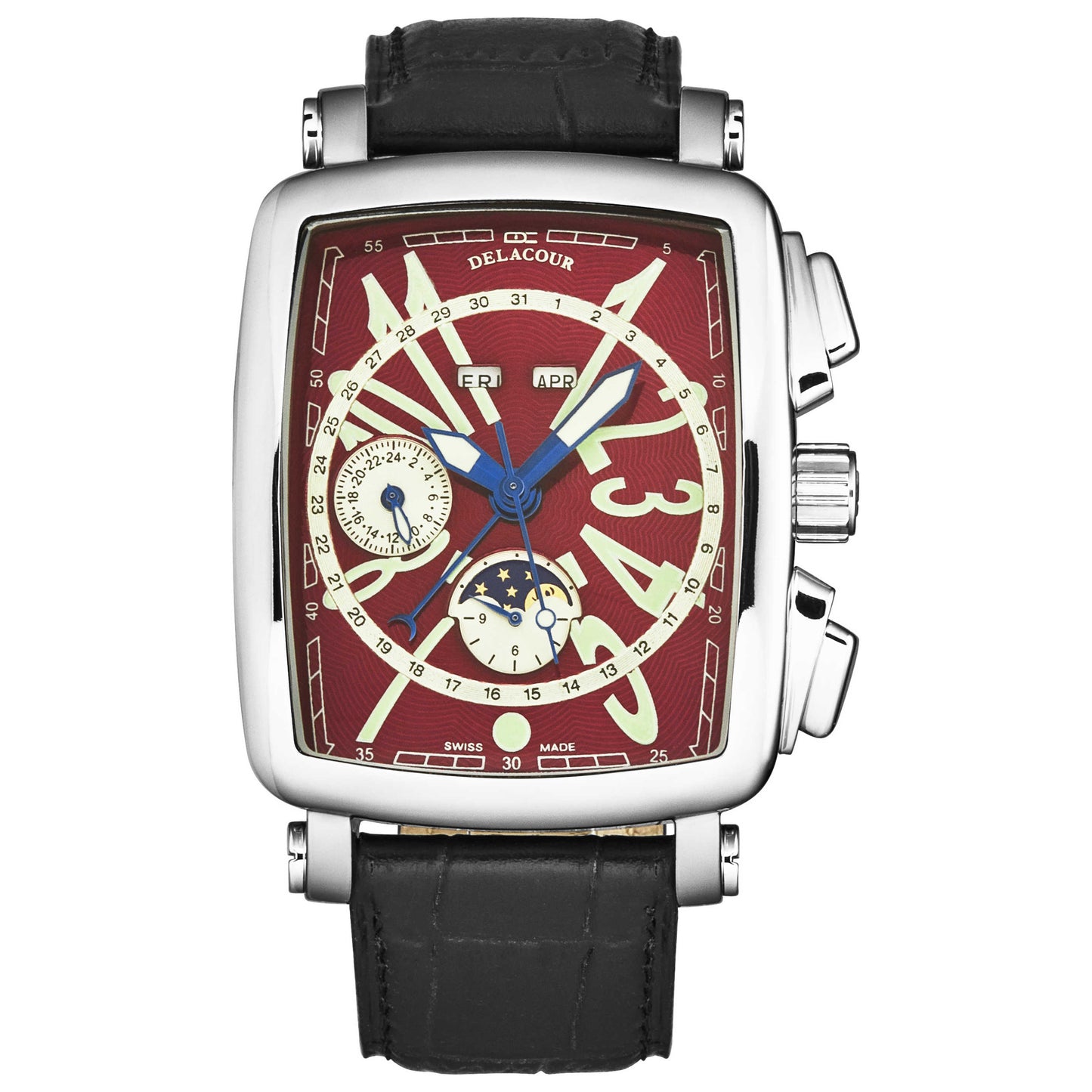 Featuring the DeLaCour ViaLarga chronograph, a pinnacle of precision crafted in Switzerland. This men's timepiece features a rectangular stainless steel case, scratch-resistant sapphire crystal, and an exhibition back that showcases its automatic movement. A vivid red dial complements the black leather strap with a pin buckle, harmonizing functionality with a dash of flair. The ViaLarga not only offers a chronograph and date function but also boasts a water resistance of 30m. Perfect for the discerning individual who values both performance and style. WAST1026-RED