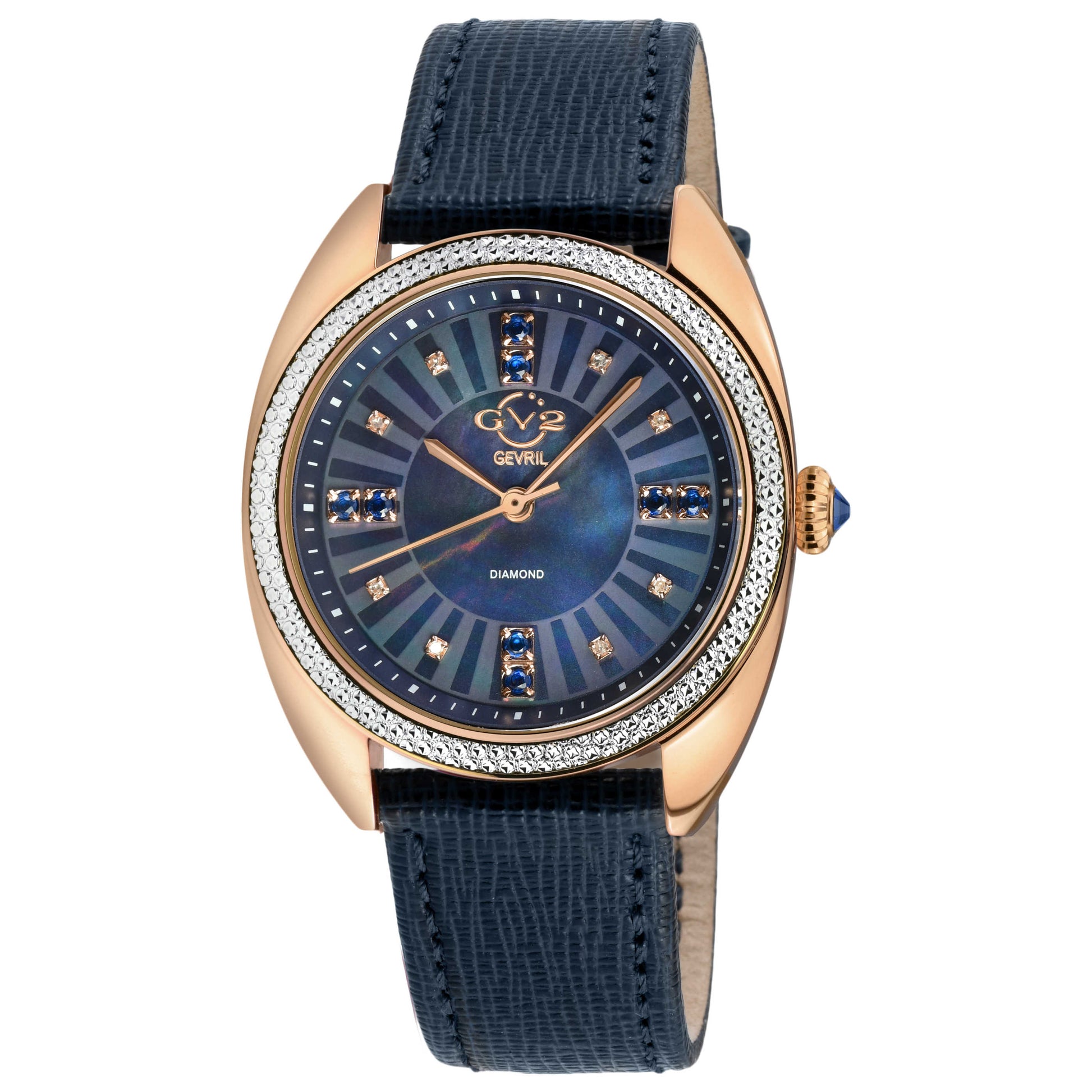 GV2 by Gevril introduces the Palermo collection, epitomizing Swiss elegance with a feminine twist. This stunning women's watch features a scratch-resistant sapphire crystal with an anti-reflective coating, nestled in a 35mm stainless steel case. The allure of the blue mother-of-pearl dial complements the blue leather strap, secured by a pin buckle. The Swiss-made quartz movement ensures precise timekeeping, reinforced by a 50m water resistance. Embrace timeless sophistication and functionality with the Palermo, a testament to exquisite craftsmanship made in Switzerland. 13104