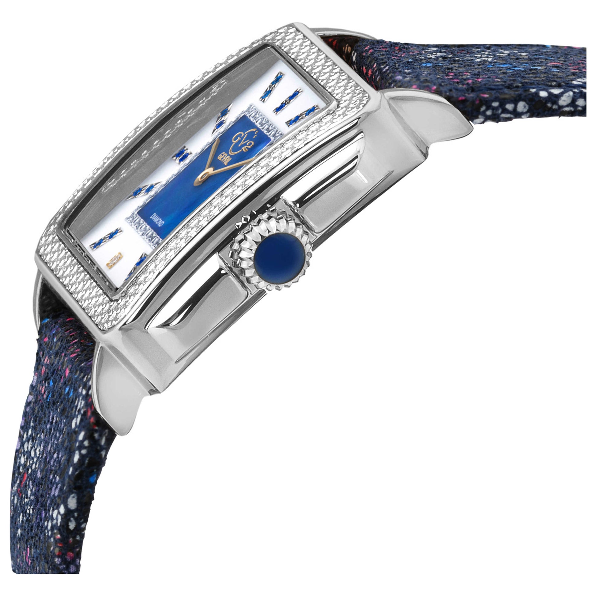 Step up your style game with the women's Padova Gemstone Floral watch by GV2 by Gevril, a piece straight out of Switzerland. This rectangular quartz timepiece houses a Swiss-Made movement, securely nestled within a 30mm stainless steel case. The case boasts a scratch-resistant, anti-reflective sapphire crystal and a closed back, ensuring its durability up to 50m underwater. Underneath, lies a captivating blue mother-of-pearl dial. A blue floral leather strap enhances its charm, providing a comfortable fit with a pin buckle clasp. Enjoy this delightful fusion of function and style. 12332F