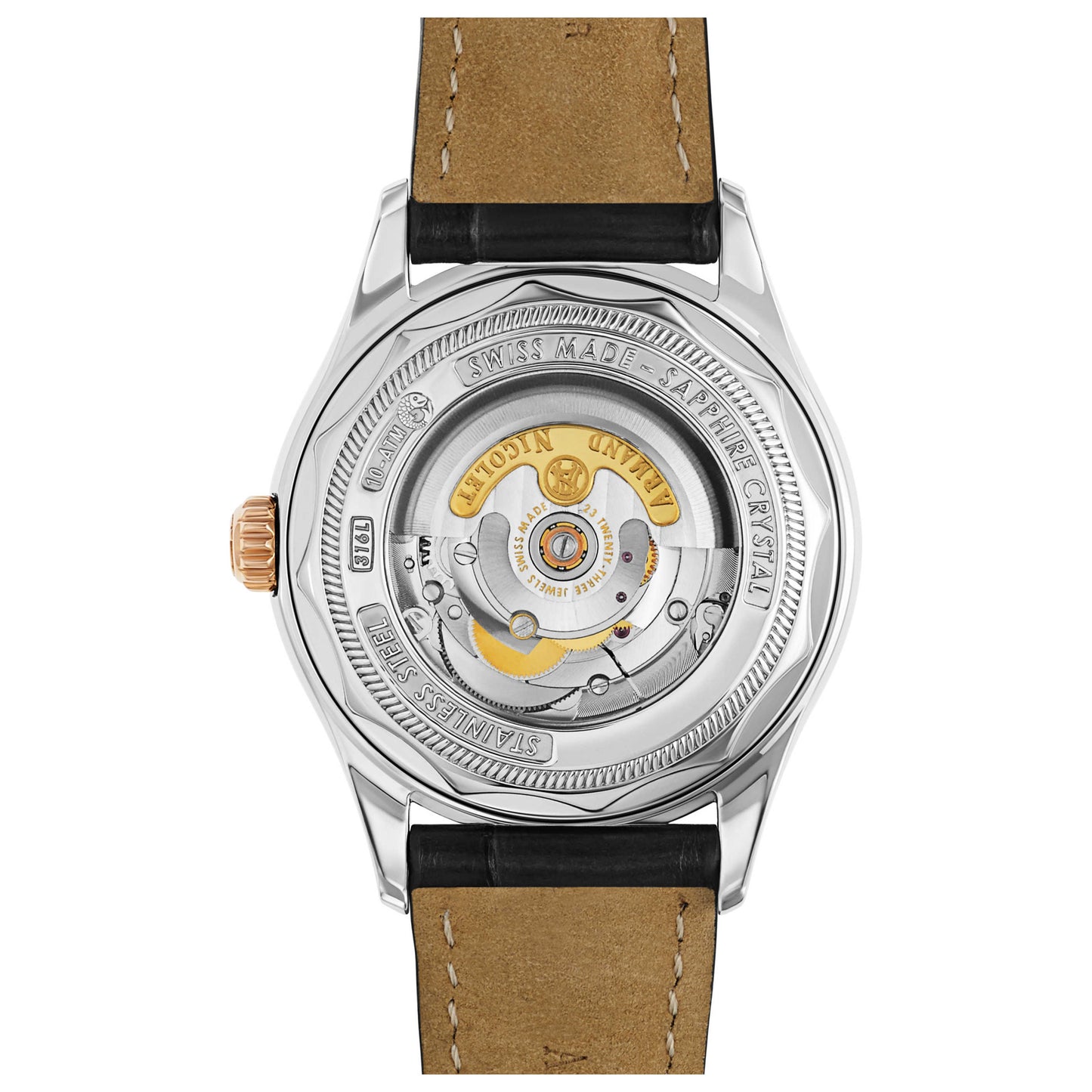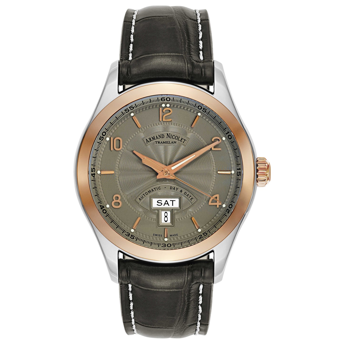 Armand Nicolet, M02, Men's Watch, Stainless Steel, 18K Rose Gold Case, Leather Alligator Strap, Swiss Mechanical Automatic (Self-Winding), 8740A-GS-P974GR2