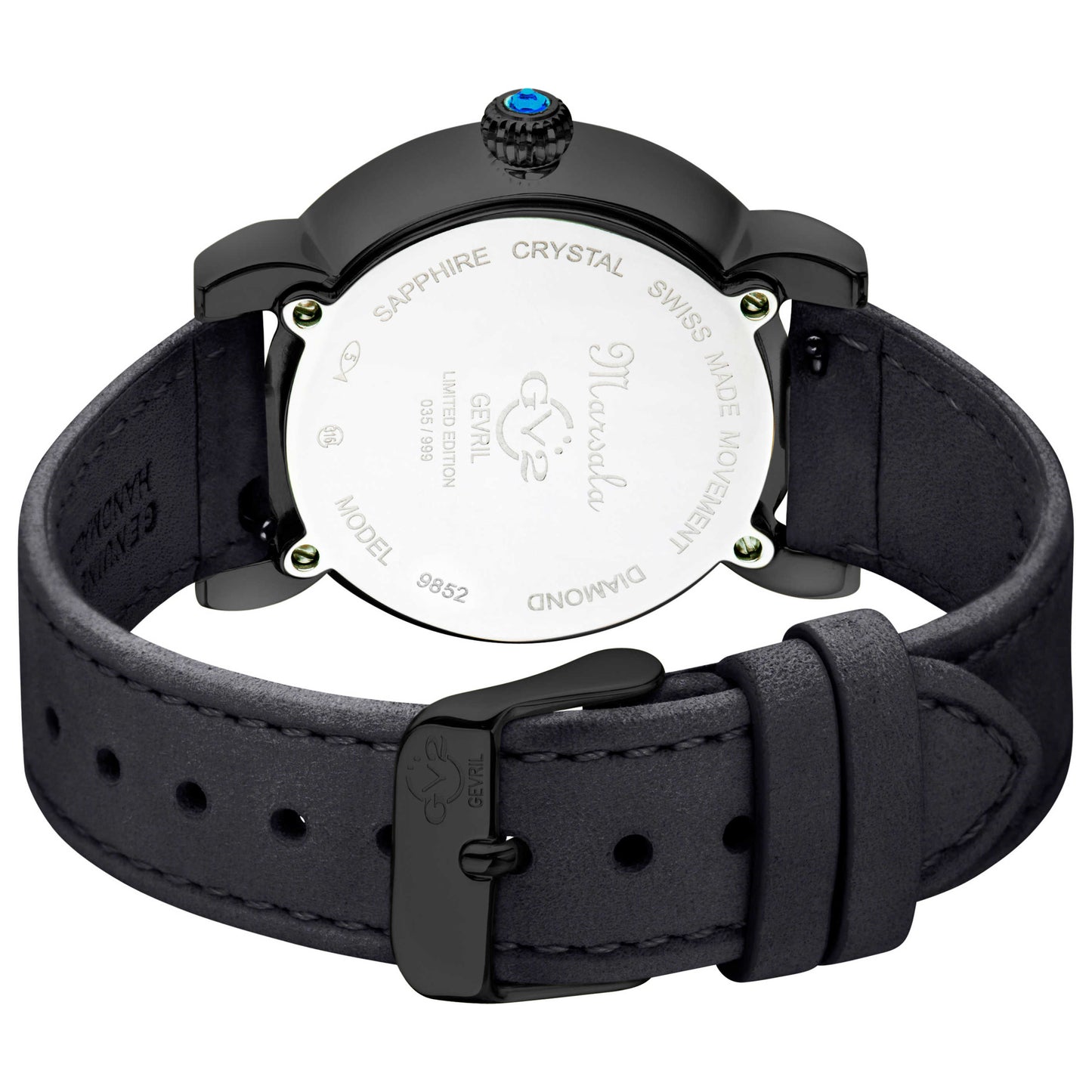 Unleash the distinct charm of the GV2 by Gevril Marsala Tortoise Collection. This Swiss-made women's watch blends precision with style, featuring a quartz movement encased in stainless steel with a scratch-resistant sapphire crystal. The round 36mm case is complemented by a black mother-of-pearl dial and a luxurious black leather strap with a pin buckle. Water-resistant up to 30m, this timepiece proves both fashionable and functional, capturing the essence of timeless sophistication. 9852