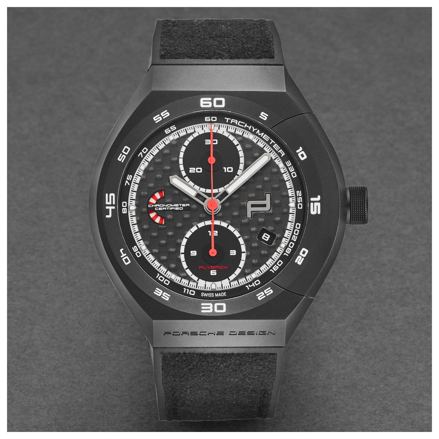 Introducing the Porsche Monobloc Actuator watch, a must-have for men who appreciate a blend of robust performance and sleek style. Made in Switzerland, this automatic timepiece showcases a stunning black dial encased in a 45.5mm titanium case. Protected by a scratch-resistant sapphire crystal and boasting an exhibition case back, it offers remarkable durability with a water resistance of up to 100m. Enhance your timekeeping with the chronograph feature and stay updated with the date display. The watch is complemented by a black rubber strap with a secure deployment clasp, enhancing the overall sophisticated appeal of this Swiss-made masterpiece. 6033.601009.062