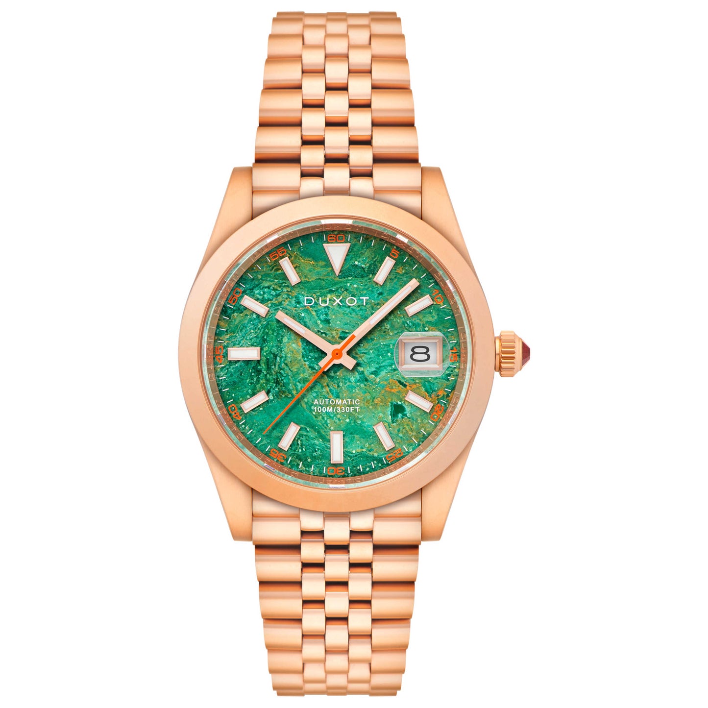From the esteemed Vezeto Collection by Duxot, discover the men's automatic watch crafted for precision and durability. With its made-in-Japan Seiko - NH35 movement boasting a 40-hour power reserve, and encased in rose gold tone stainless steel with scratch-resistant sapphire crystal, this timepiece exemplifies robust design. Rounded off with a stylish green dial and date feature, all secured by a rose gold stainless steel bracelet with a fold-over clasp, it promises sophistication for every occasion. DX-2061-BB