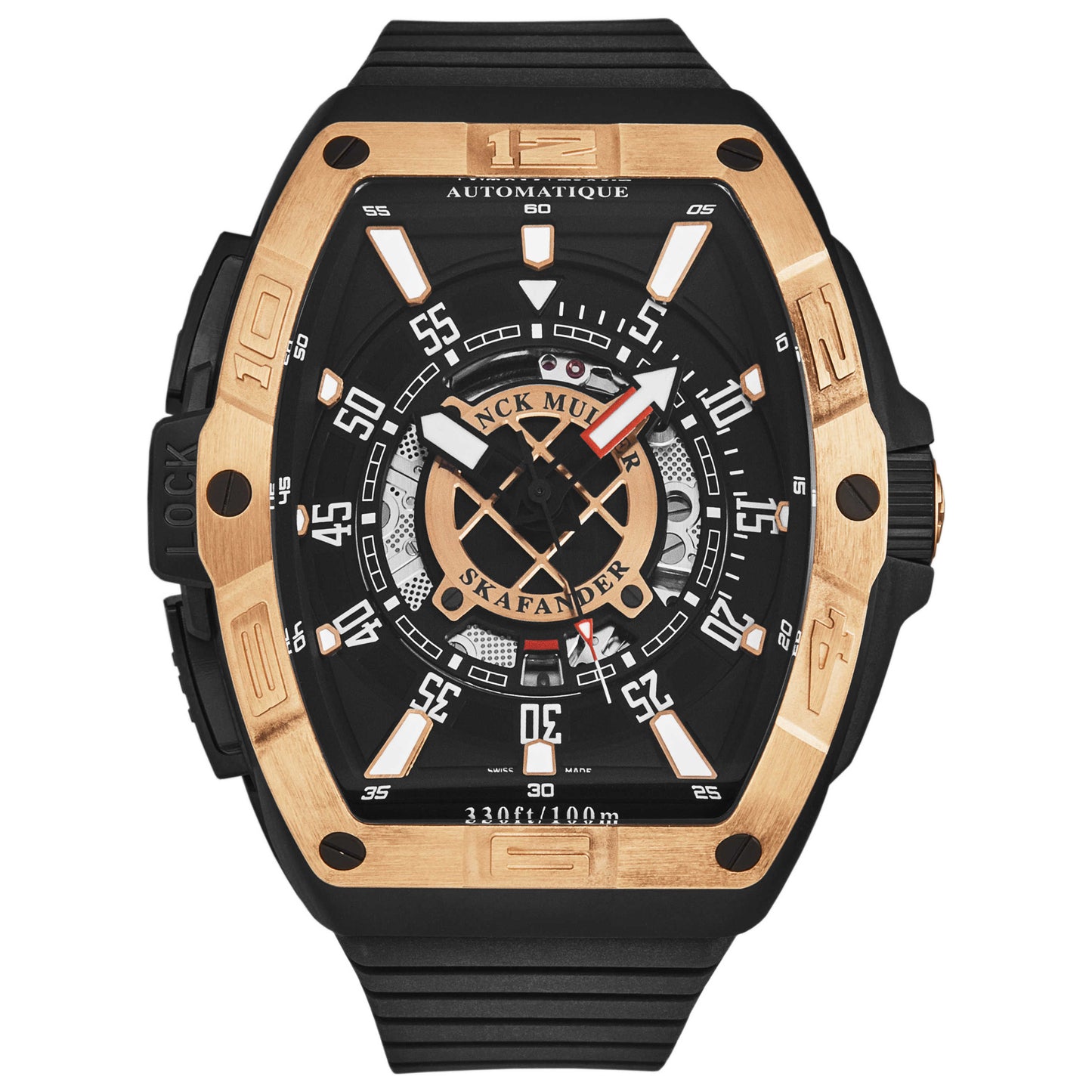 Experience unmatched precision with the Franck Muller Skafander men's watch, masterfully crafted in Switzerland. This automatic timepiece is powered by a Swiss-made movement and has a robust 42-hour power reserve. The 46mm barrel tonneau titanium case houses a sophisticated black dial, protected by scratch-resistant sapphire crystal. The watch's functionality is enhanced by its 100m water resistance and a secure screw-down crown. Complementing its robust nature is a black rubber strap with a deployment clasp, giving it an edge in both durability and style. 46SCSKFBLKBKGD1