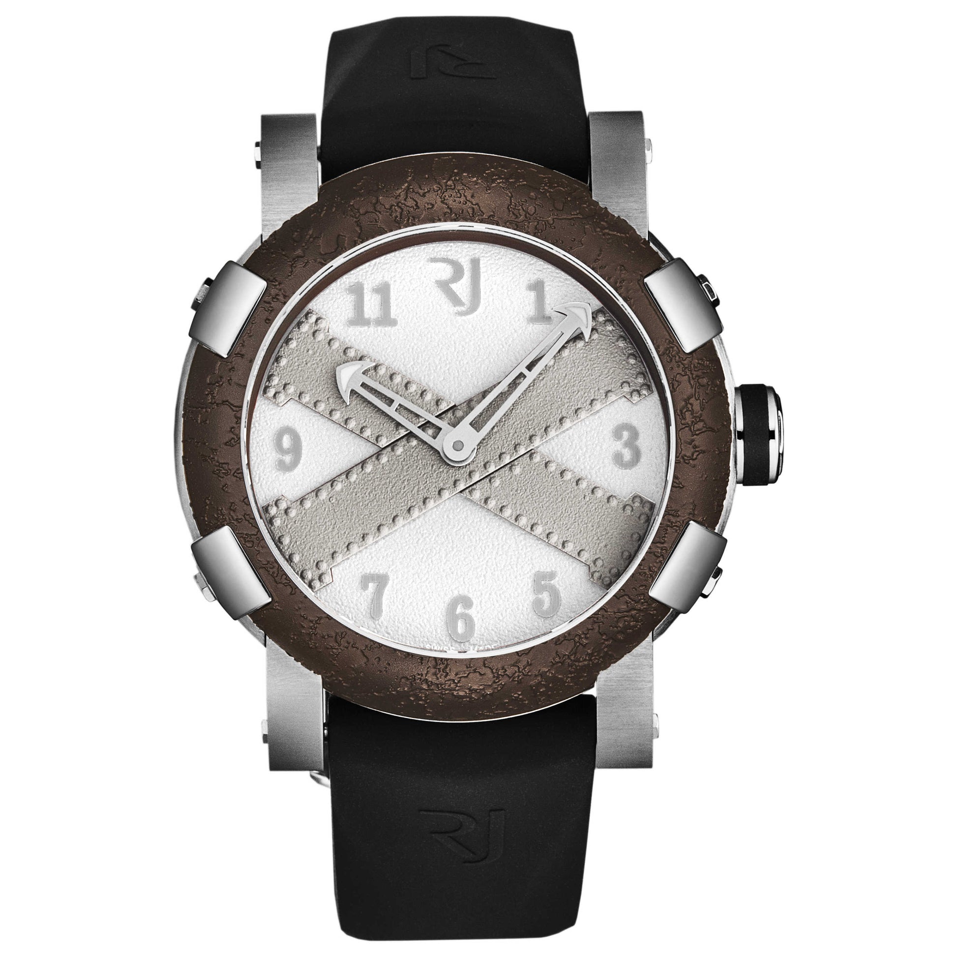 Elevate your style with the Romain Jerome Titanic A La Grande men's watch, a distinctive piece made in Switzerland. Enclosed within a 46mm stainless steel case is a clean white dial protected by a scratch-resistant sapphire crystal. The automatic, Swiss-made movement ensures precision timekeeping, operated by a pull and push crown. The round watch offers durability with its closed case back and a water resistance up to 30m. Adding to its appeal, the timepiece features a sleek black rubber strap, providing comfort and secured with a deployment clasp. A robust companion for any modern man's wardrobe. RJTGAU.201.10
