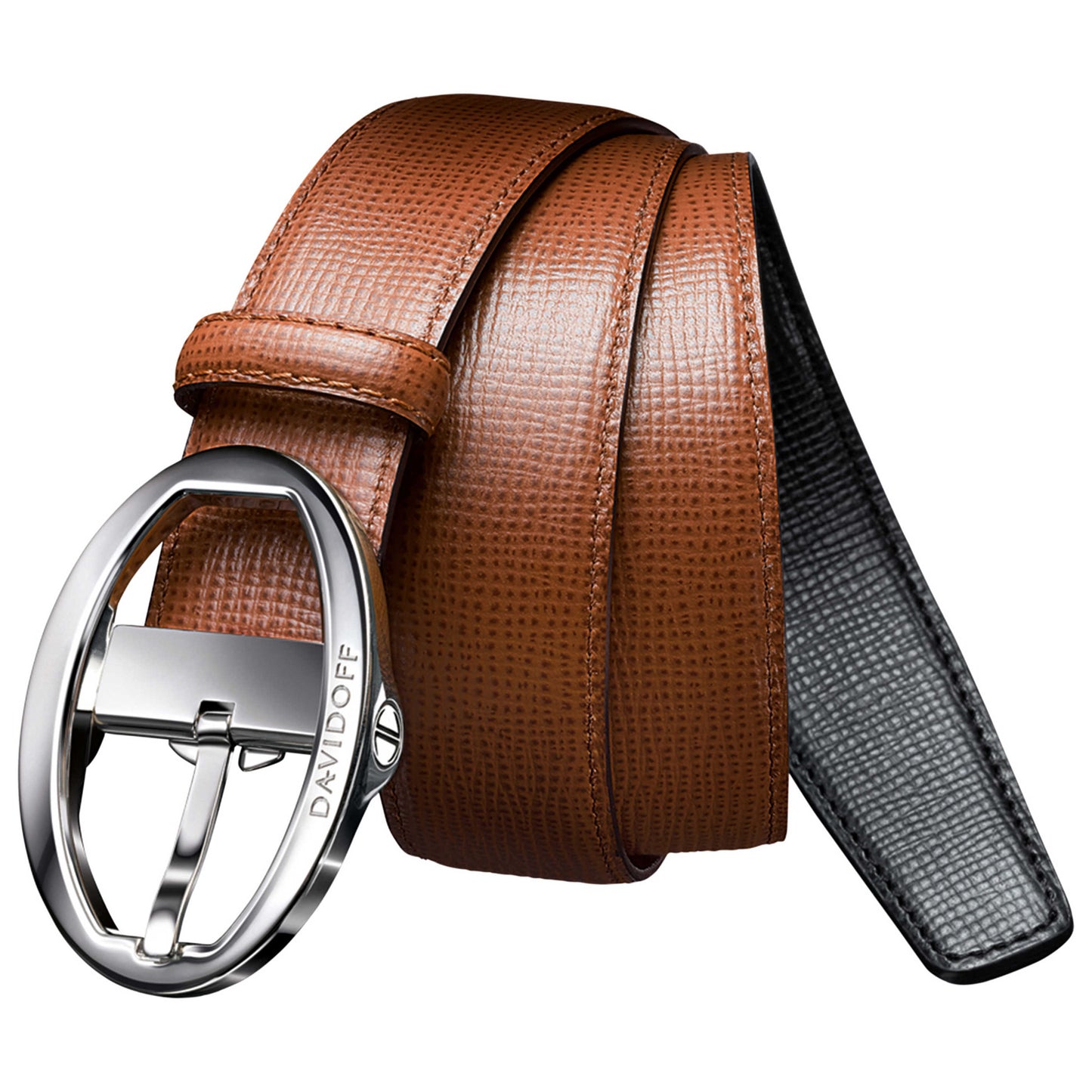 European calfskin leather belt with palladium buckle. Made in Italy. Belt is reversible to black or cognac. Size 44 (110/125 cm)