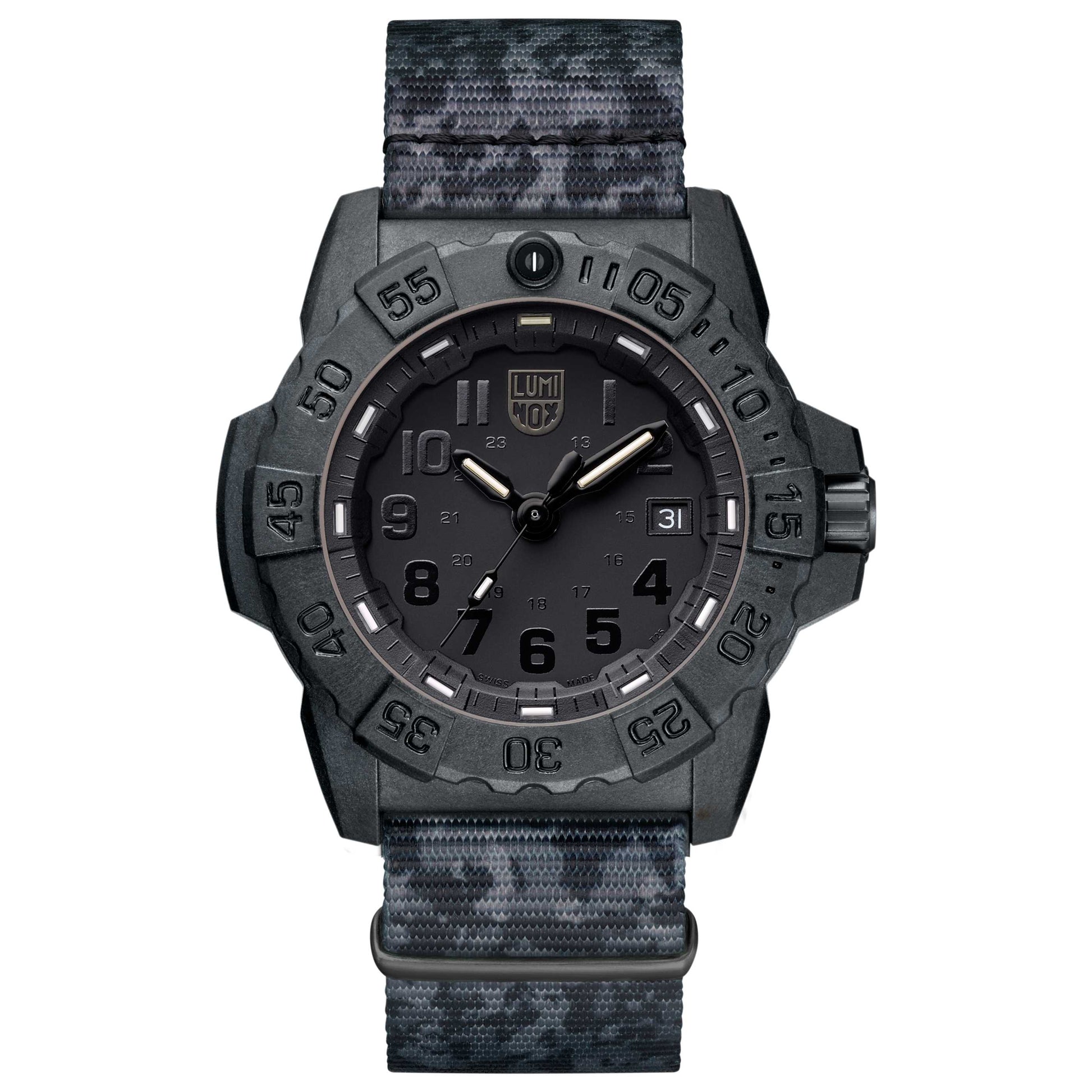 The Luminox Navy SEAL Chronograph 3581 Blackout takes tactical timekeeping to its stealthiest form. Featuring a bold 45mm CARBONOX™ case and matching black dial, bezel, and camo strap, this chronograph is built for low-profile performance in any environment.