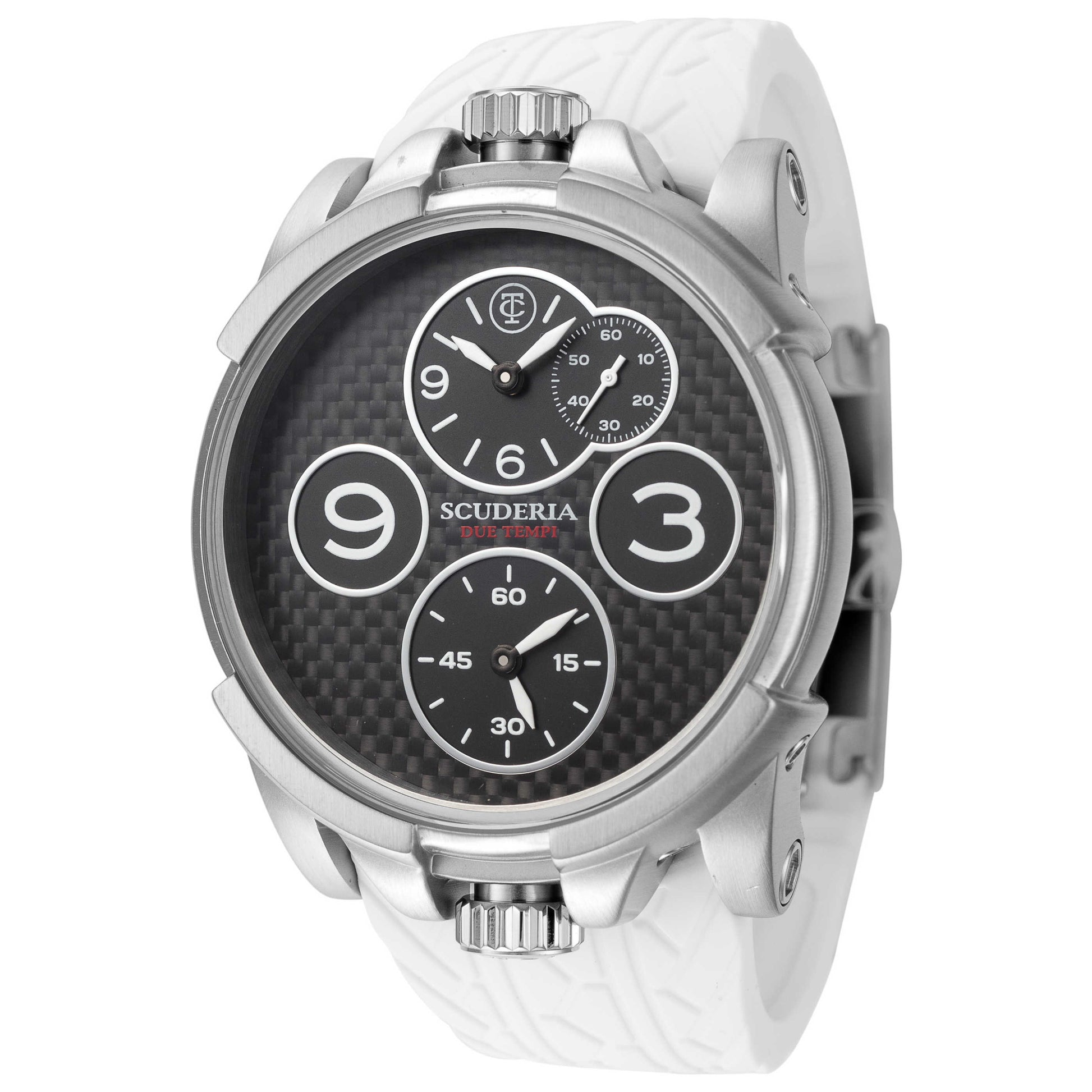 Indulge in the refined aesthetics of the CT Scuderia Due Tempi men's watch, a true testament to premium Japanese craftsmanship. This round quartz timepiece is powered by dual Miyota 1L45 and Miyota 2025 movements and is secured with a screw-down crown for extra protection. The 40mm stainless steel case is housed under mineral crystal and provides water resistance up to 50m, while the black dial is offset by a white silicone strap that fastens comfortably with a pin buckle. As a unique feature, this watch offers a dual time function, perfect for the modern, globe-trotting man. CT-270-P