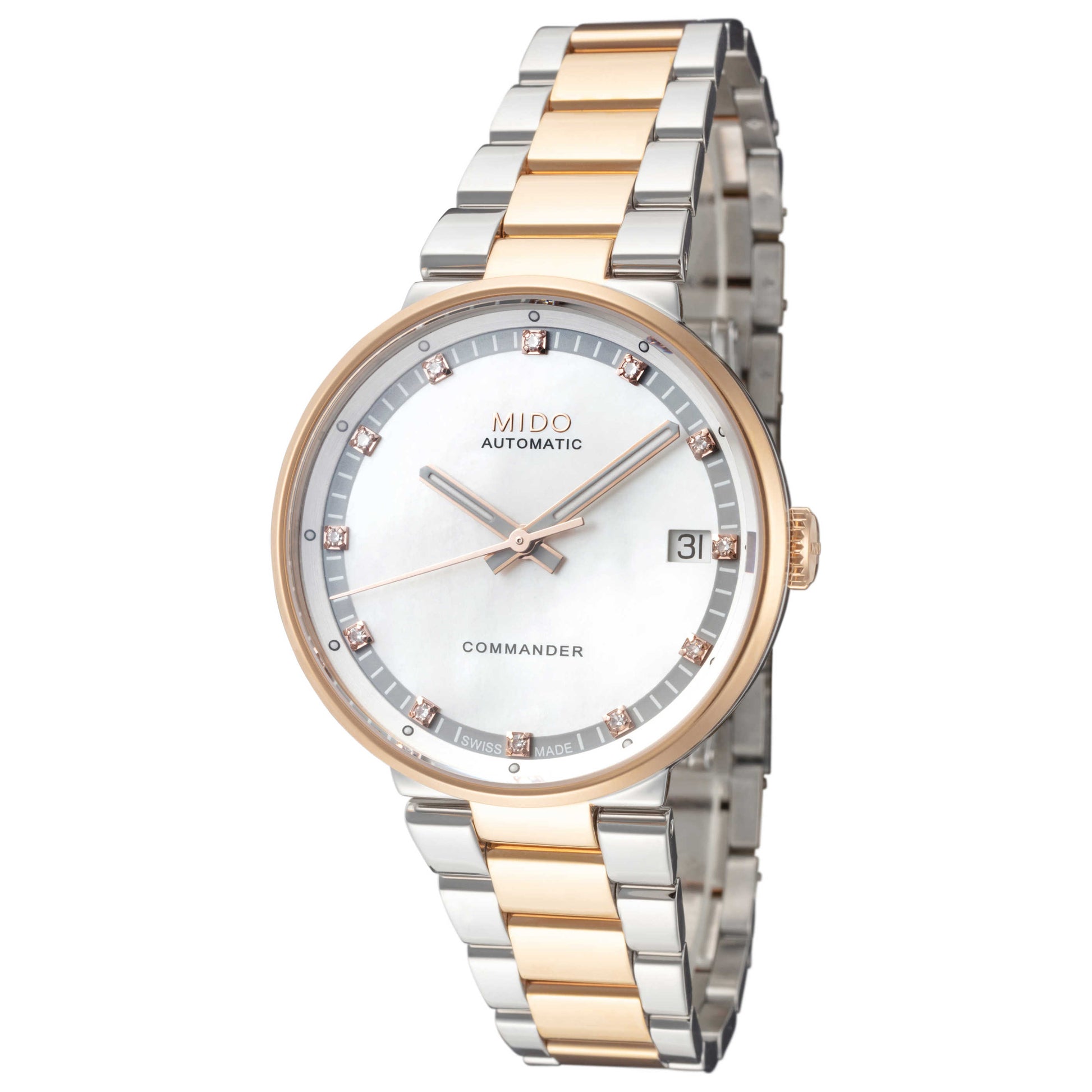 Elevate your look with the Mido Commander II, a sophisticated automatic watch designed for women. This Swiss-made accessory features a 33mm round stainless steel case housing a lustrous silver mother-of-pearl dial, encased in scratch-resistant sapphire crystal. Built to withstand water depths of up to 50m, it ensures lasting resilience with a closed back. The elegant two-tone stainless steel bracelet accentuates the watch's refinement, secured by a reliable fold-over clasp. Imbued with Swiss quality, the automatic movement within is sure to keep you timely. M0142072211680