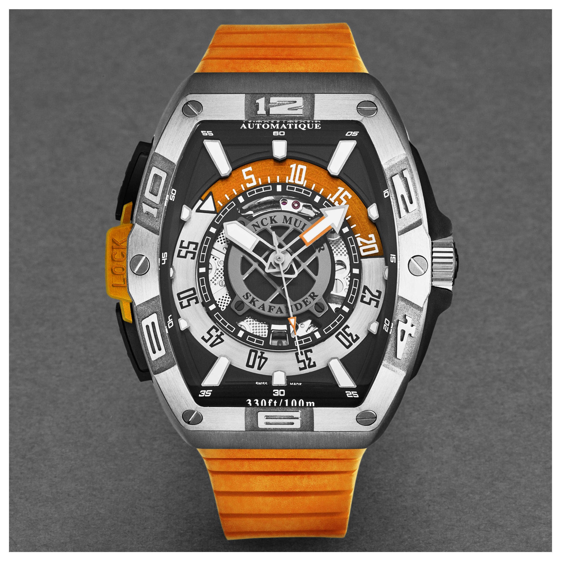 Unveil your masculine style with the Franck Muller Skafander watch, a Swiss-made barrel tonneau timepiece exuding rugged charm. The automatic movement, encased within a robust 46mm titanium case, offers a notable 42-hour power reserve. With its screw-down crown, the watch boasts an impressive water resistance of up to 100m. Ensconced under a scratch-resistant sapphire crystal is a sleek black dial, paired perfectly with an orange rubber strap that secures with a deployment clasp. This watch is not just an accessory, it's an epitome of style and functionality for every man. 46SCSKFBLKORG