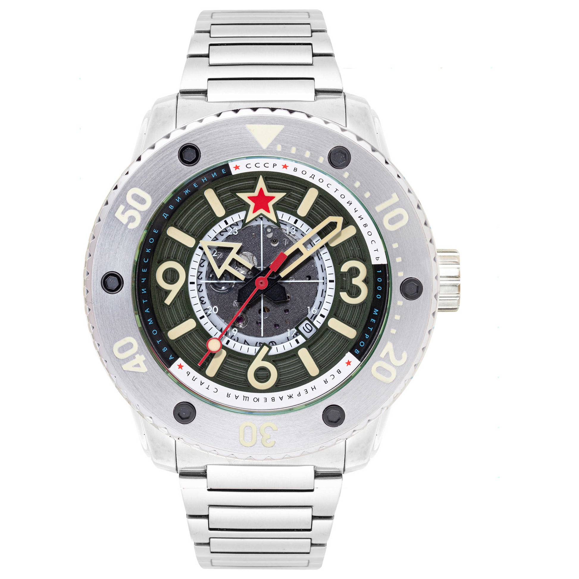Showcase your style with the CCCP Naval Barrakuda watch, a striking timepiece made for the modern man. This automatic Miyota 8215 movement watch, made in Japan, has a 40-hour power reserve and a pull and push crown. It boasts a round 54mm stainless steel case with a scratch-resistant sapphire crystal, making it durable and water-resistant up to 1000m. The watch displays a captivating green dial and features a silver stainless steel bracelet, ensuring a perfect fit with its deployment clasp. It's a combination of top-notch functionality and contemporary design. CP-7094-33