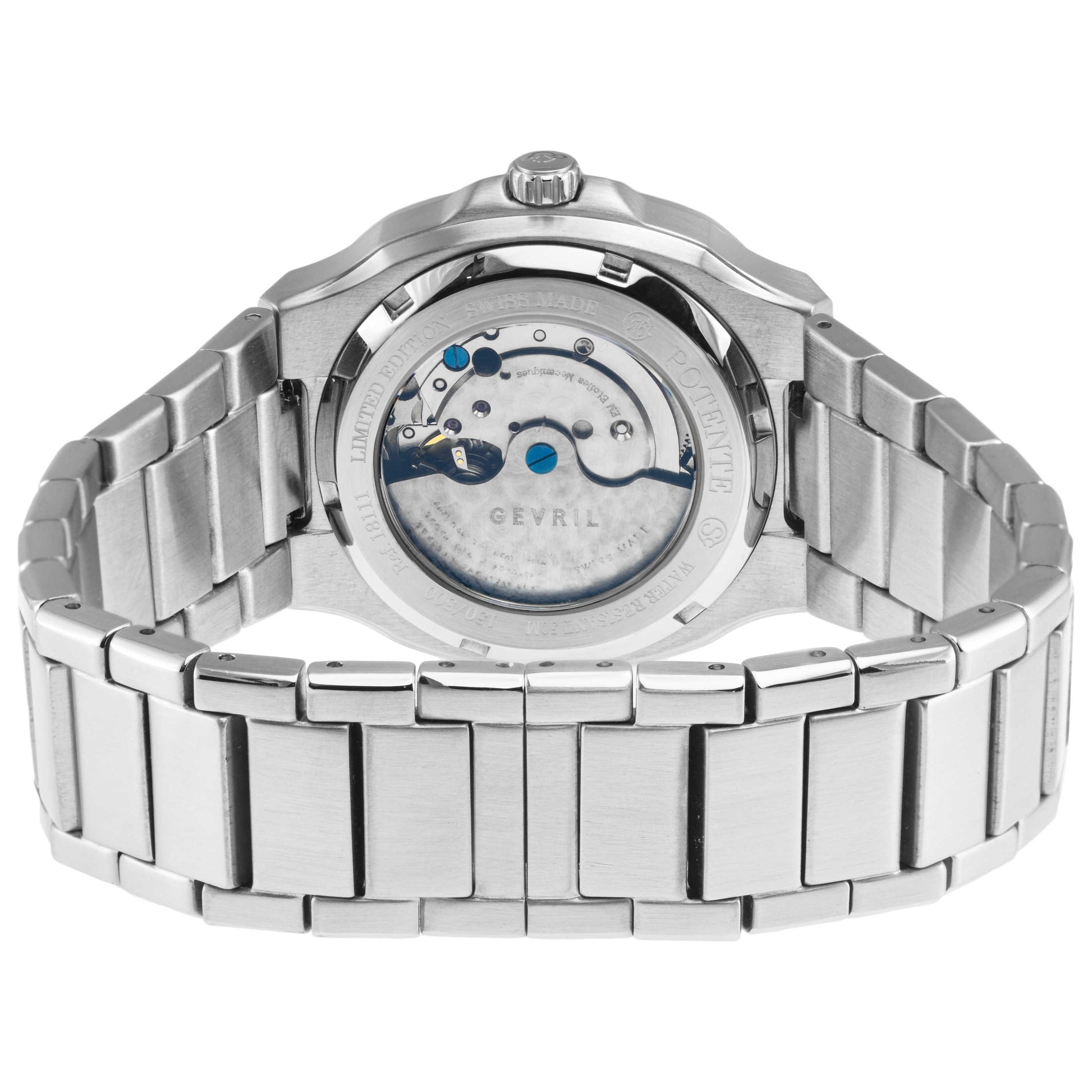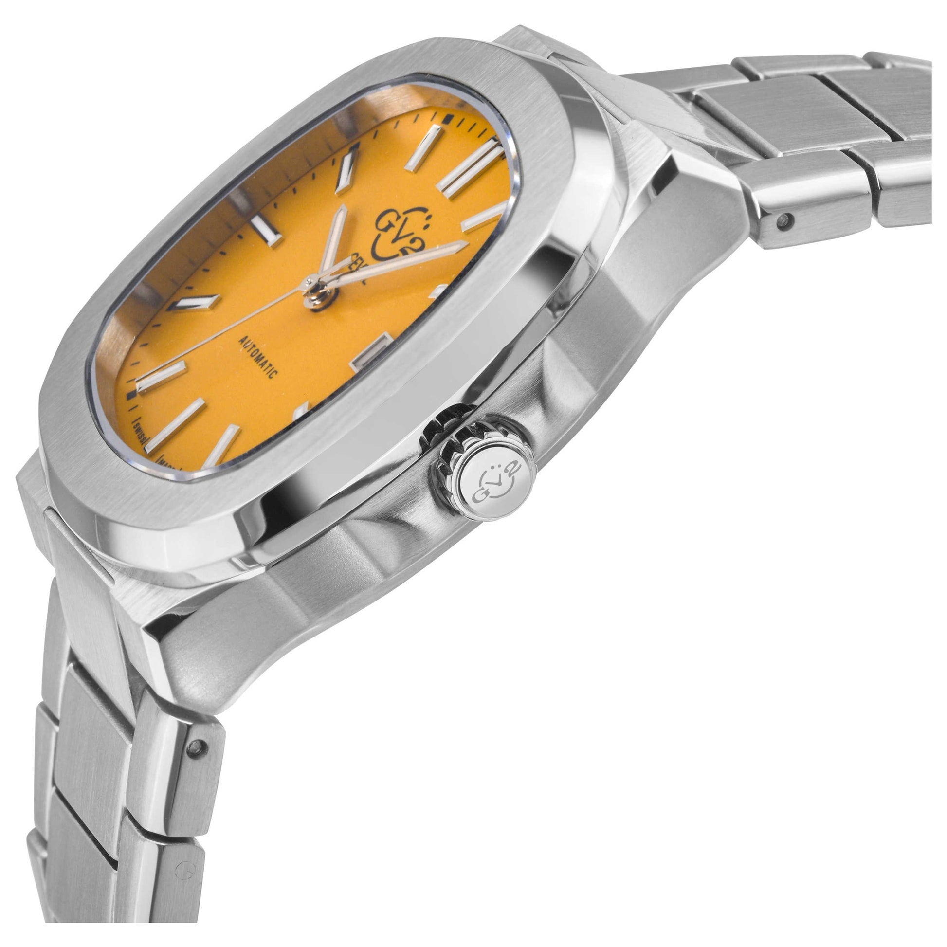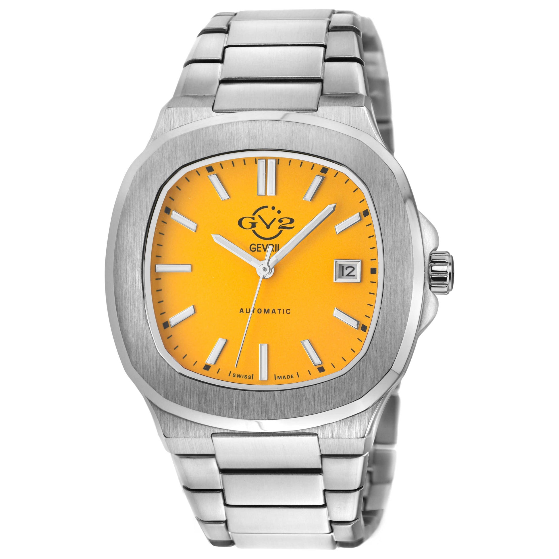 Meet the GV2 by Gevril Potente, a men's watch with distinctive appeal. Swiss-made and automatic, it features a sleek cushion-shaped, 40mm stainless steel case and a vibrant yellow dial, all protected by scratch-resistant, anti-reflective sapphire crystal. An exhibition case back reveals the intricacy of the movement within. The stainless steel bracelet in silver adds a classic touch, securing firmly with a deployment clasp. With its pull and push crown and a water resistance of up to 50m, this timepiece offers the perfect blend of function and form. 18111B