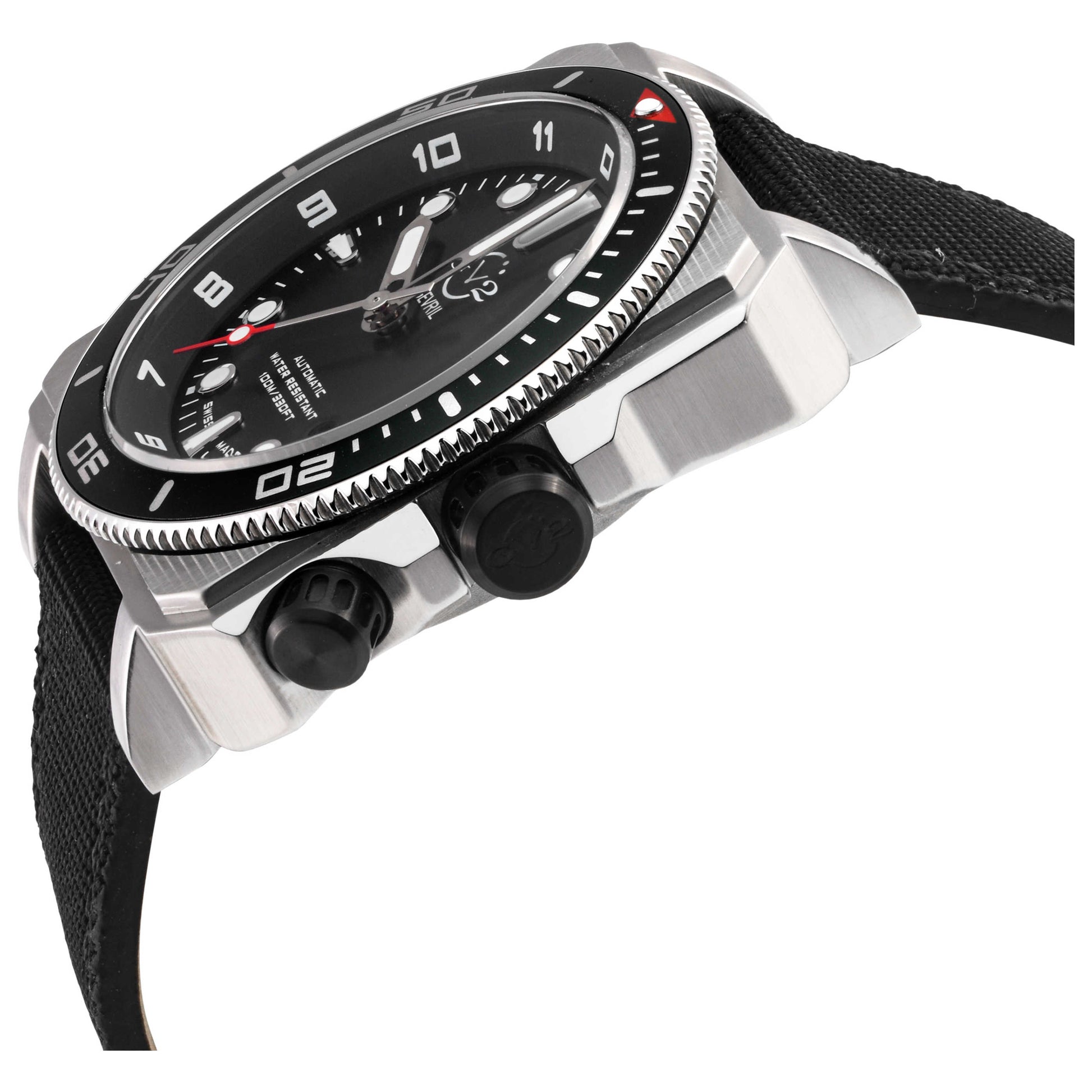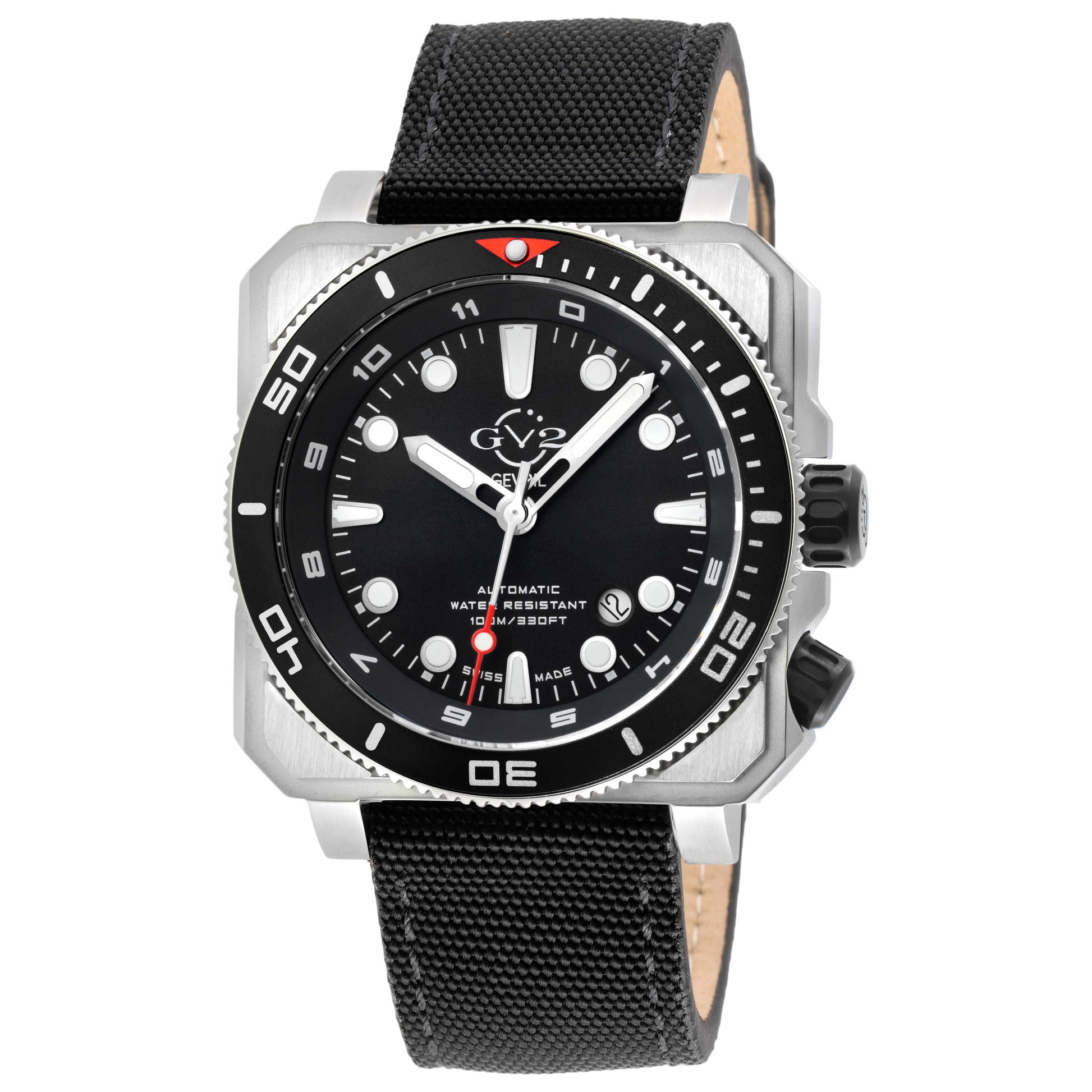 Elevate your style with the XO Submarine collection from GV2 by Gevril, a perfect fusion of sophistication and functionality for the modern man. Expertly Swiss-made, this automatic movement watch is protected with a scratch-resistant, anti-reflective sapphire crystal. The watch sports a black dial housed in a 44mm stainless steel square case that boasts 100m water resistance. The timepiece is equipped with a date feature and a secure screw-down crown. Completing its distinctive look is a durable black canvas strap that fastens with a pin buckle. Crafted in Switzerland, it's an undeniable mark of superior watchmaking. 4541