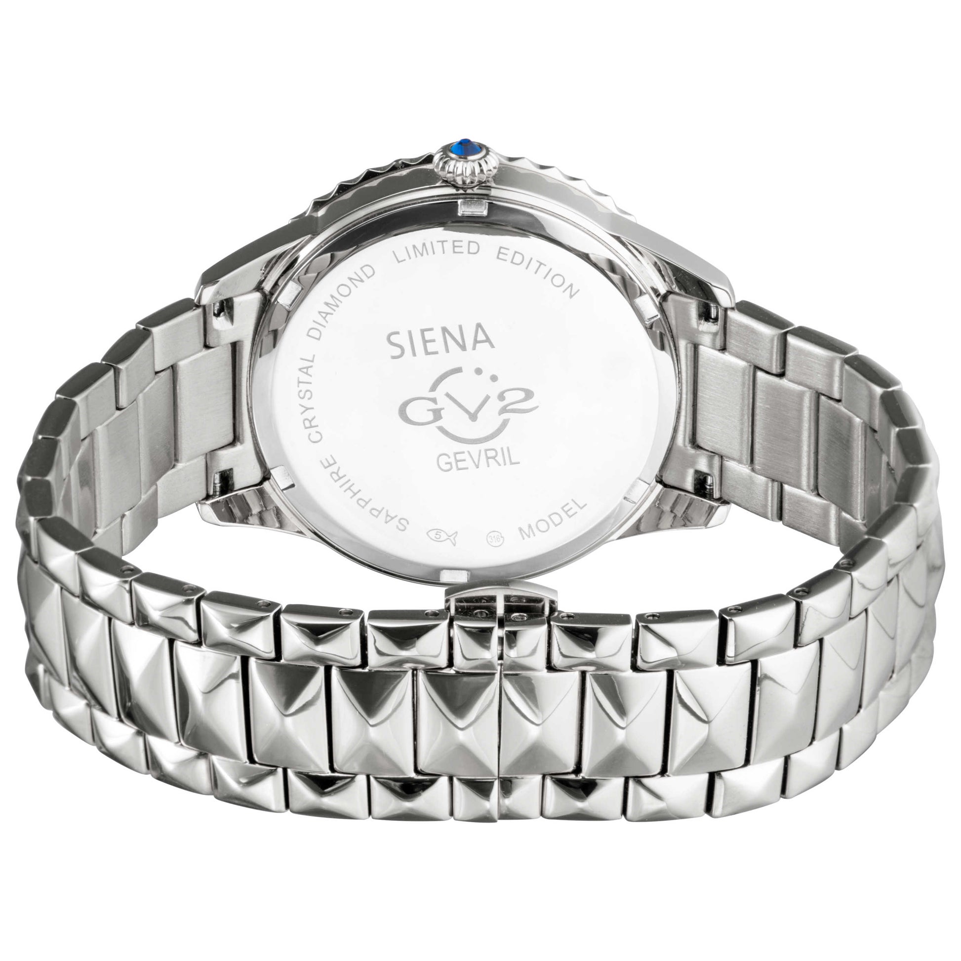 Elevate your look with the GV2 by Gevril Siena watch, a chic accessory tailored for the stylish woman. This Swiss-Made quartz movement timepiece exudes elegance with its round 38mm stainless steel case, enclosing a beautiful white mother-of-pearl dial. The scratch-resistant, anti-reflective sapphire crystal case offers superior durability. Featuring a water resistance of up to 30m and a sturdy pull and push crown, it ensures reliable function. The silver stainless steel bracelet lends a seamless finish, securing with a deployment clasp for a comfortable fit. 11700-424