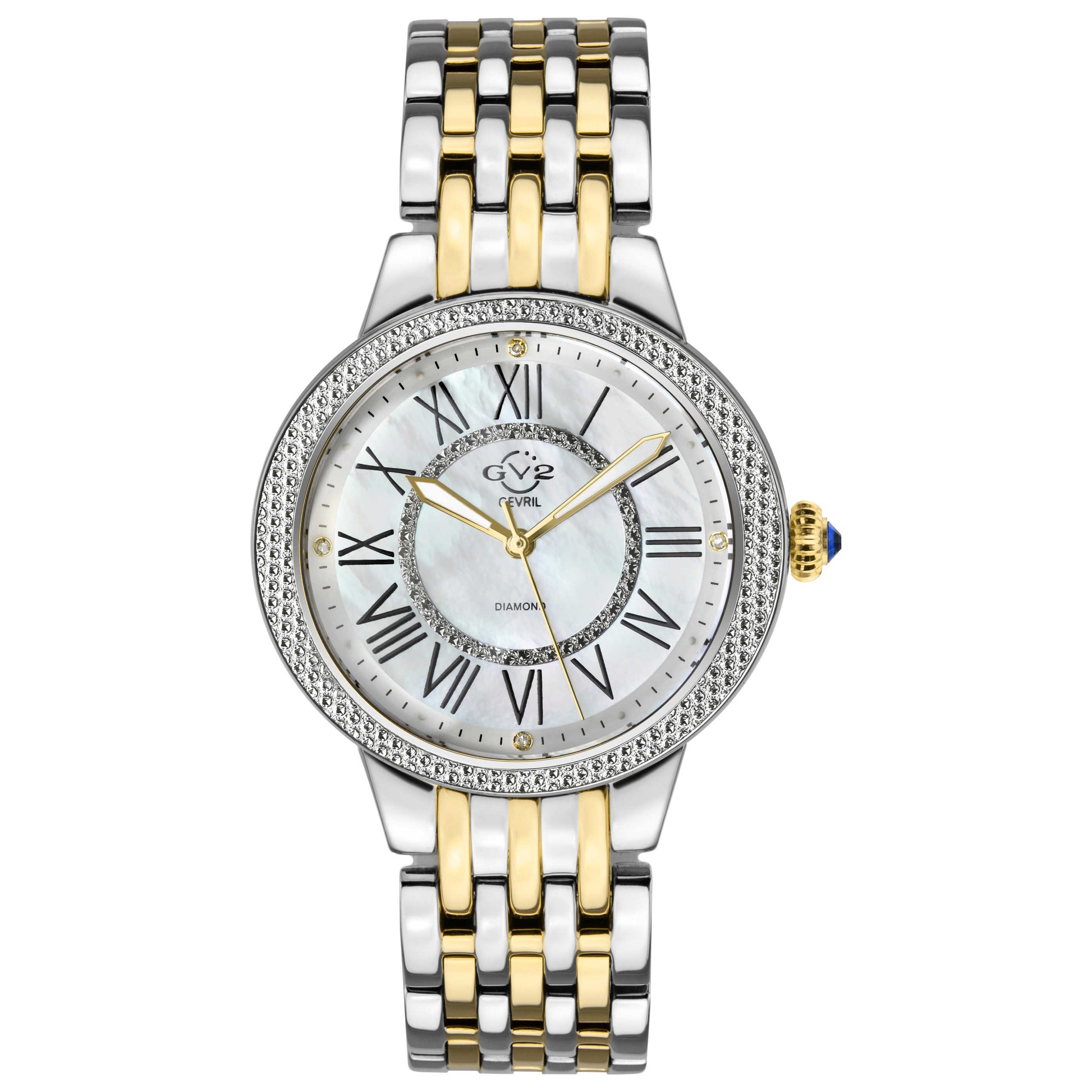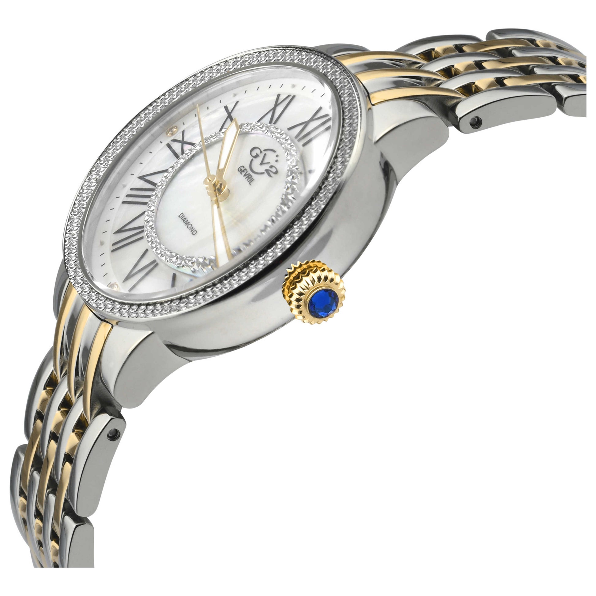 Elevate your look with the Swiss-made GV2 by Gevril Astor II watch, a timepiece crafted for women who seek timeless elegance. This quartz movement watch features a round 38mm stainless steel case with a captivating white mother-of-pearl dial encased in scratch-resistant sapphire crystal with an anti-reflective finish. The pull and push crown ensures easy setting adjustments, while the closed back adds to its water resistance of up to 30m. Complementing the pristine dial is a stunning silver and gold stainless steel bracelet, secured with a deployment clasp for a secure and comfortable fit. 9145