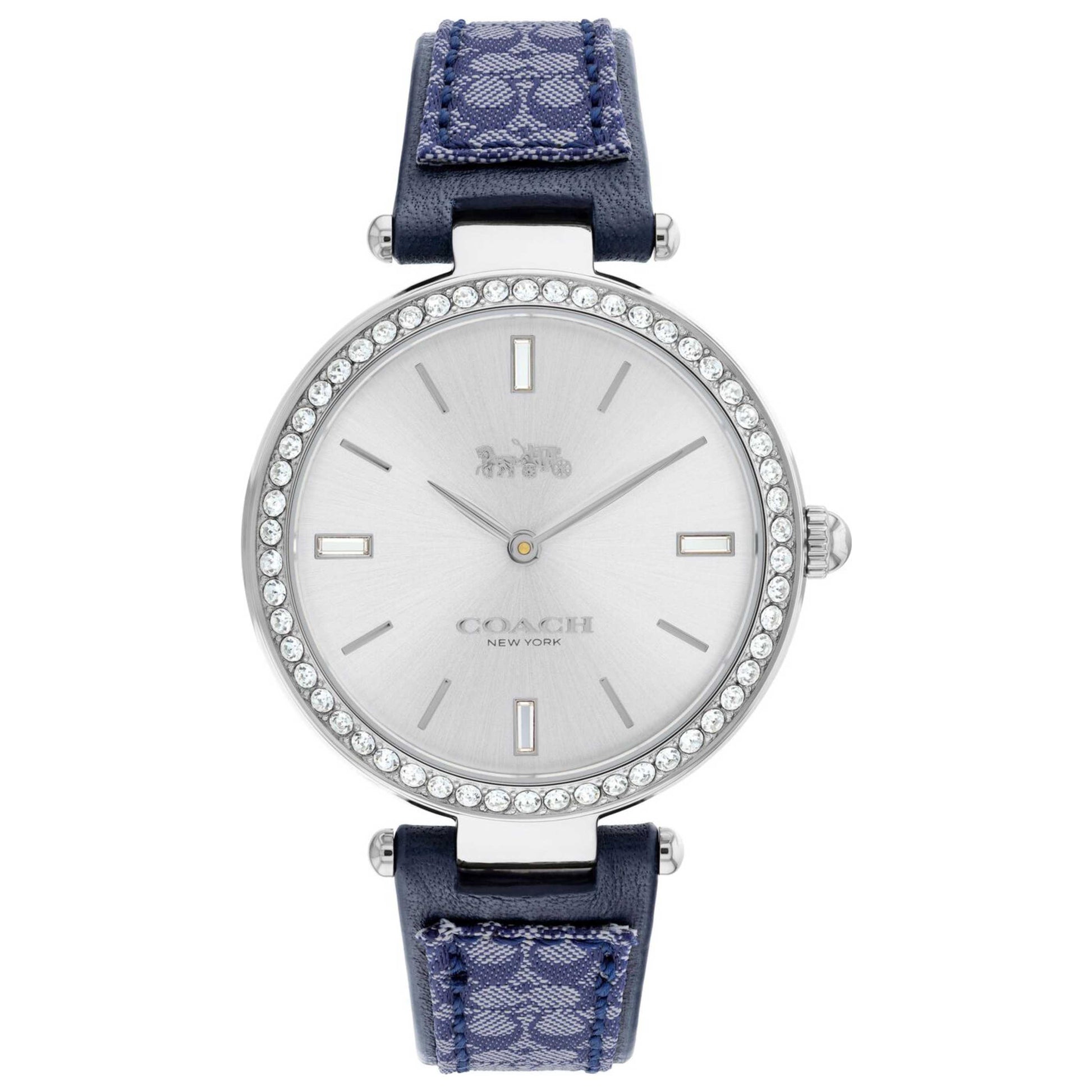 Coach presents the Park Collection, where functionality meets style for the modern woman. This quartz movement watch features a sleek round stainless steel case, measuring 34mm in width, with a durable mineral crystal. Water-resistant up to 30m, it pairs a silver dial with a chic navy leather calf skin strap, secured by a pin buckle. Ideal for everyday wear, this timepiece captures the essence of a vibrant lifestyle. 14504094