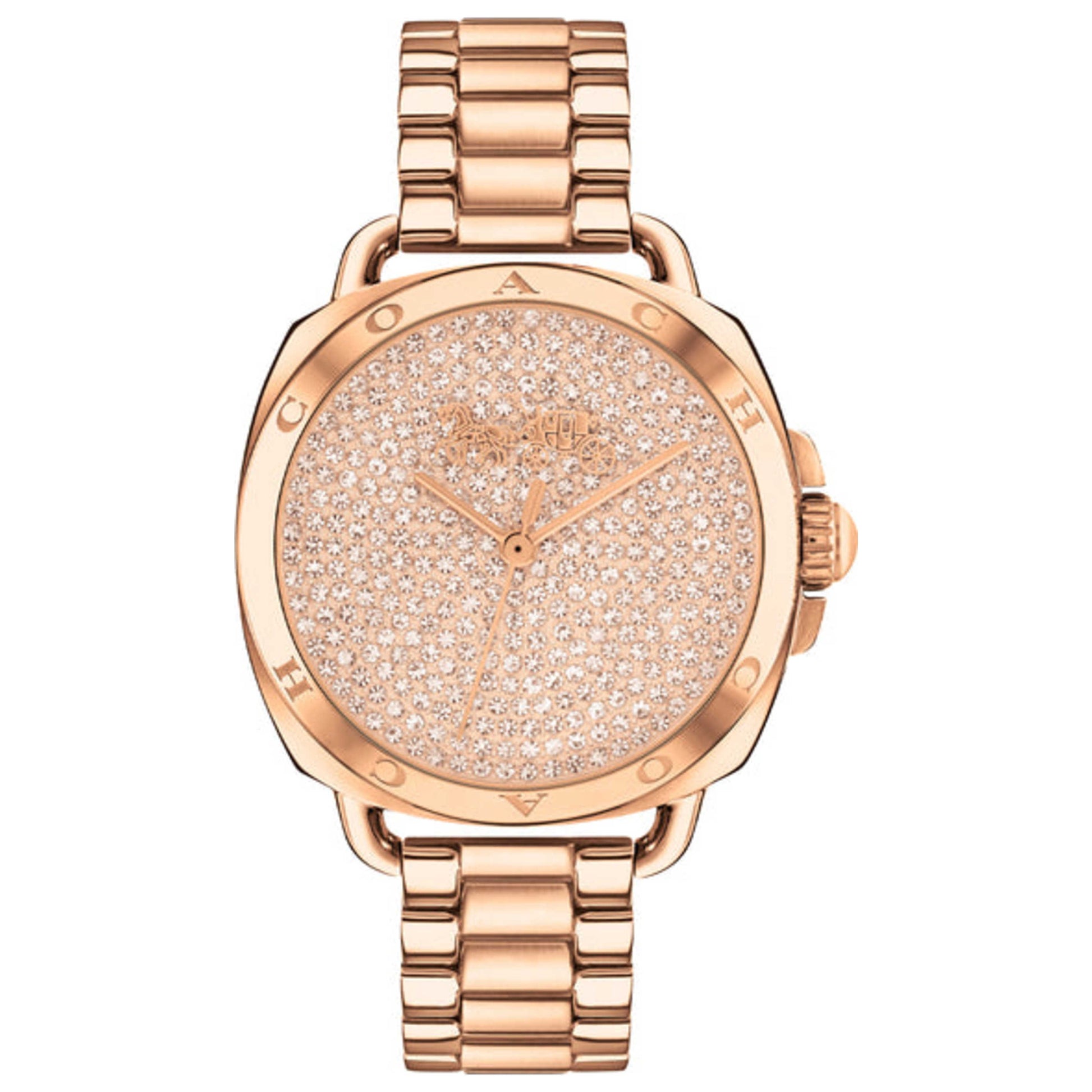 Crafted for elegance, the Coach Tatum Women's Watch exudes sophistication. The round, rose gold tone stainless steel case, complemented by a mineral crystal, houses a quartz movement, ensuring precise timekeeping. The matching bracelet with a secure deployment clasp adds to its allure. This timepiece, resistant up to 30m (100 feet), merges durability with a chic design, perfect for every occasion that calls for a touch of glamour. 14504168