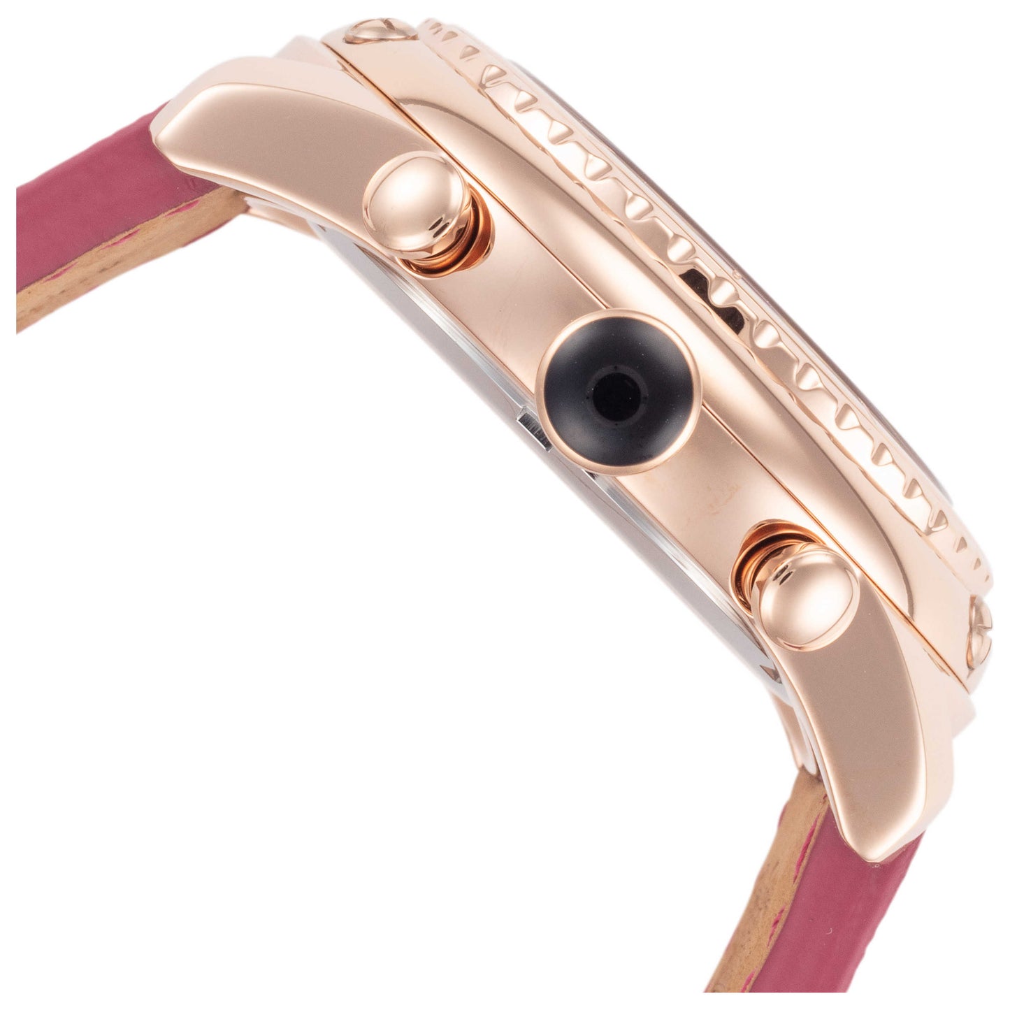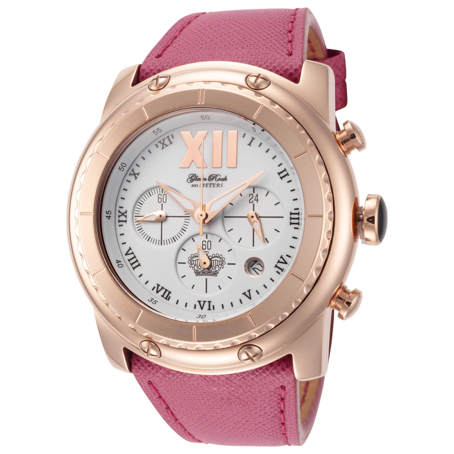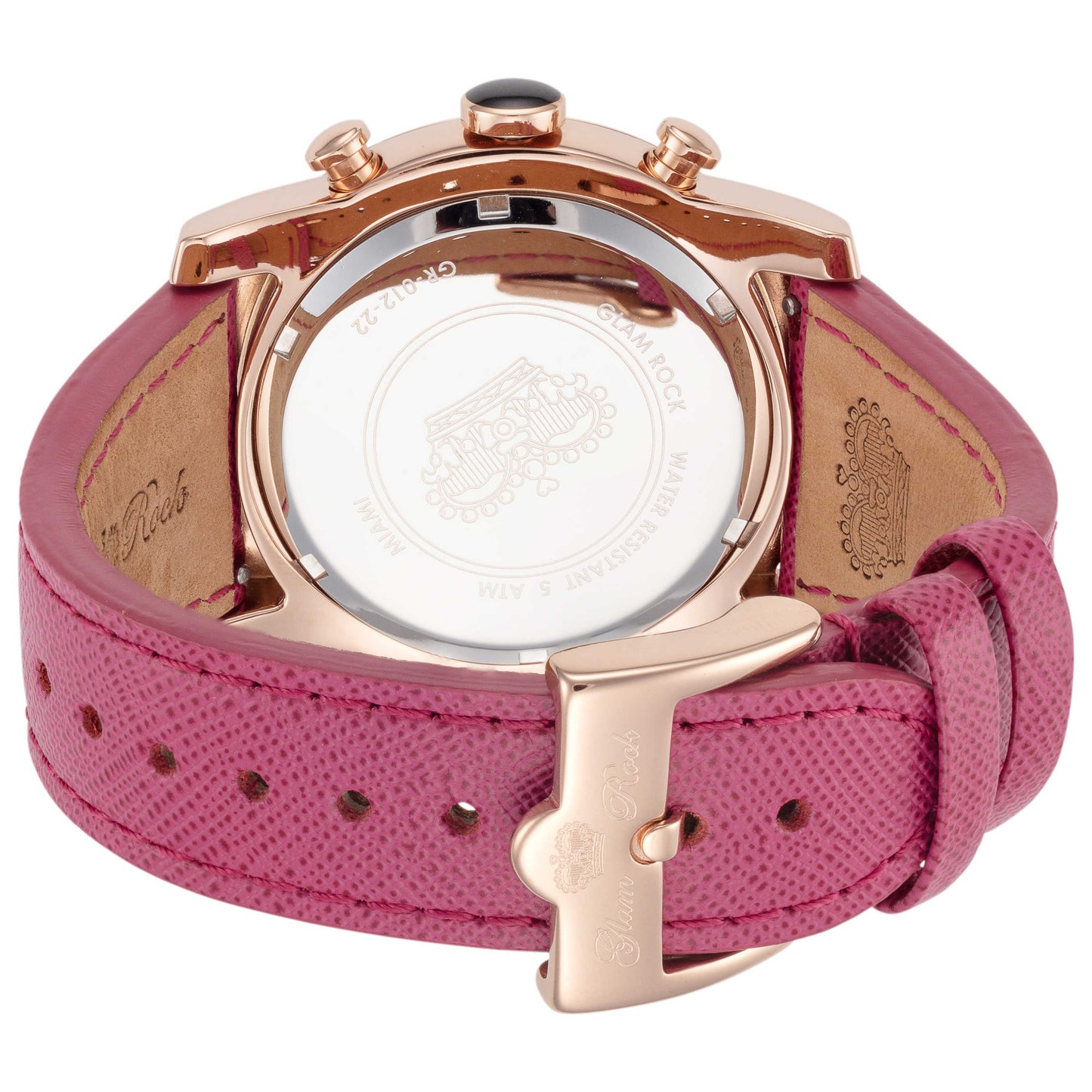 Discover the Glam Rock Miami watch, a dynamic accessory for the modern woman. This quartz chronograph, powered by the Miyota 0S20 caliber from Japan, sits within a rose gold-toned stainless steel case, round in shape, and measures 45mm in width. Featuring a pull and push crown and a closed case back, this watch is water-resistant up to 30m, perfect for casual water escapades. It displays date conveniently at 4 o'clock on its clean, white dial encased in a protective mineral crystal. A purple leather strap seals the look with a pin buckle. Experience glamour and function together with this outstanding timepiece. GR-012-22