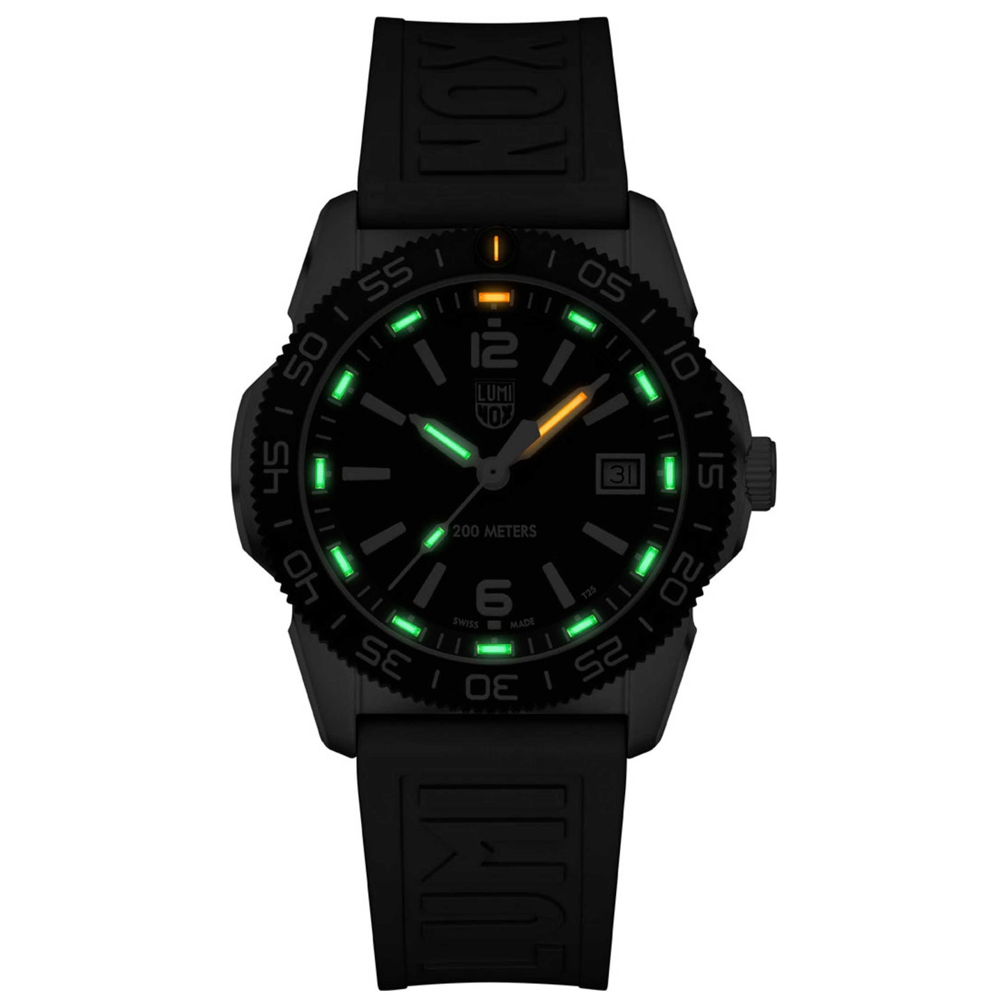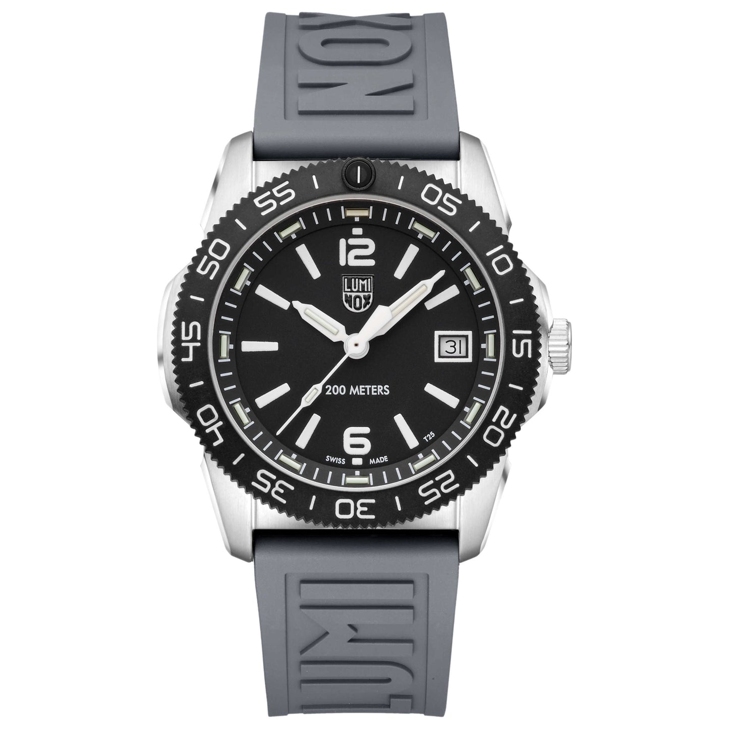 Available in a 39mm case, the Luminox Pacific Diver Ripple, combines a stainless steel case, together with a CARBONOX™ bezel, resulting in an eye-catching fusion of materials. An easy to read black dial with white numerals and hands is combined with a grey cut-to-fit rubber strap, for a sporty look. As with any Luminox, it features our cutting-edge Luminox Light Technology, for self-powered illumination for up to 25 years.